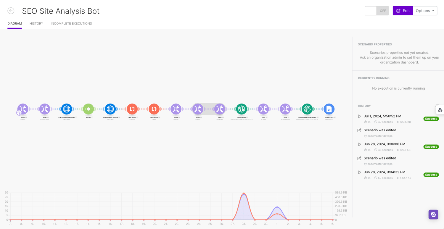 This scenario automates the process of analyzing e-commerce websites for SEO performance, persuasive language, and overall strategies. It uses Google Custom Search to find relevant sites, ScrapingNinja to scrape content, and GPT-4 to analyze the data and create detailed reports and customer personas, which are then saved to Google Docs.