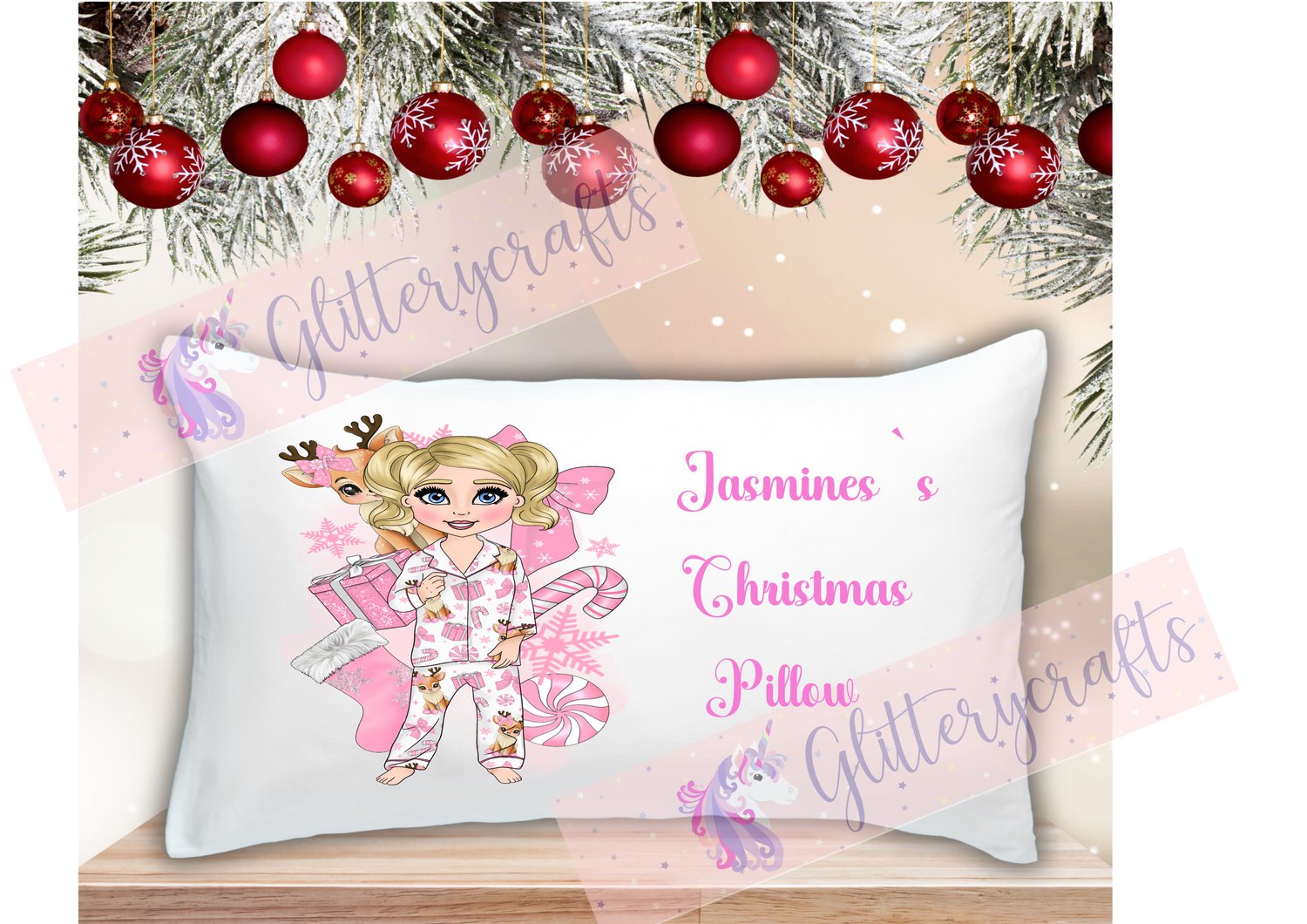 Pillowcase with little girl with blonde pigtails and reindeer with personalised name.