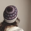 The hat begins with a provisional cast on in the striped section. After a few stripes are worked you change to the colorwork section, which is completed with crown shaping. The remaining part of the striped section is then picked up again and finished the same way as the colorwork side.
