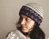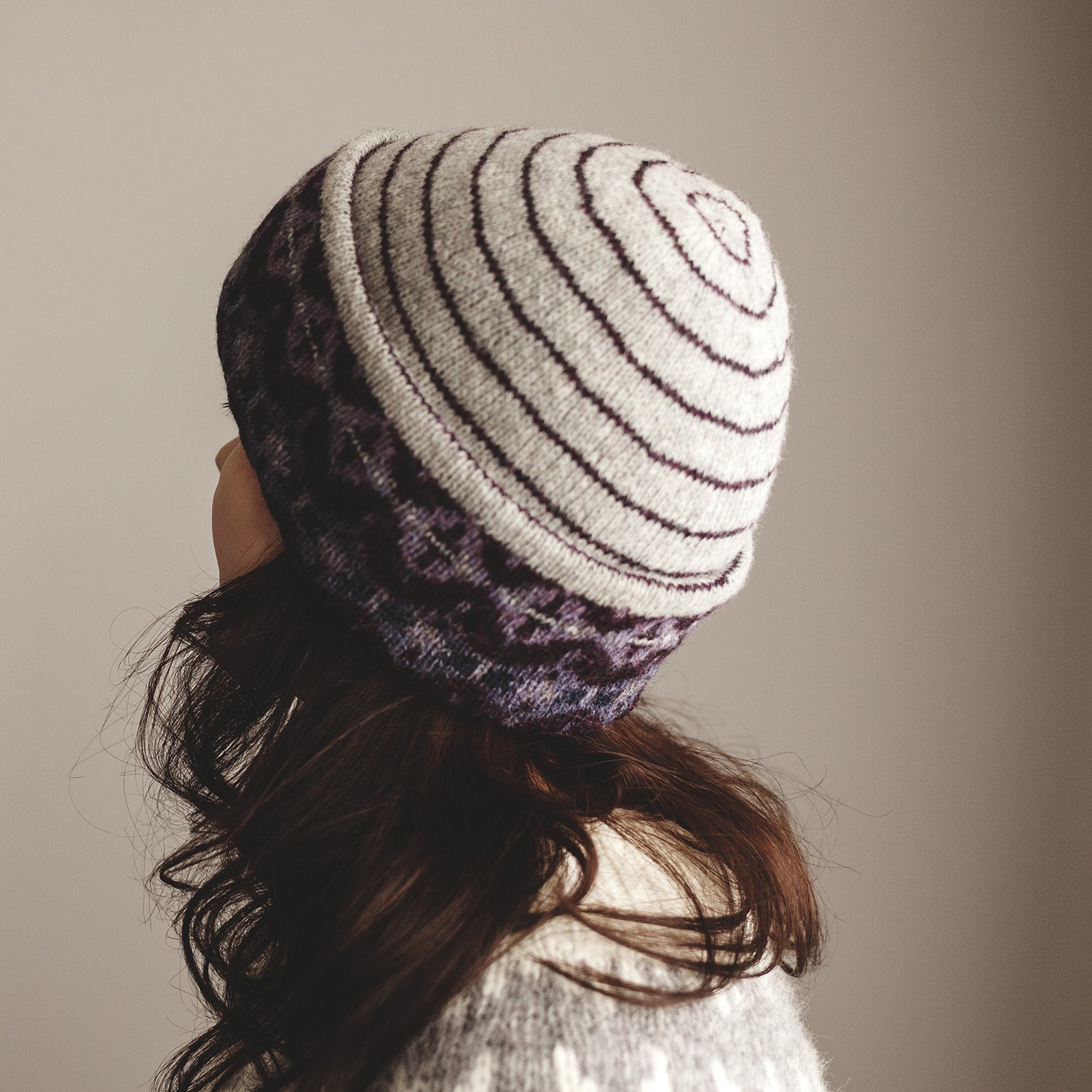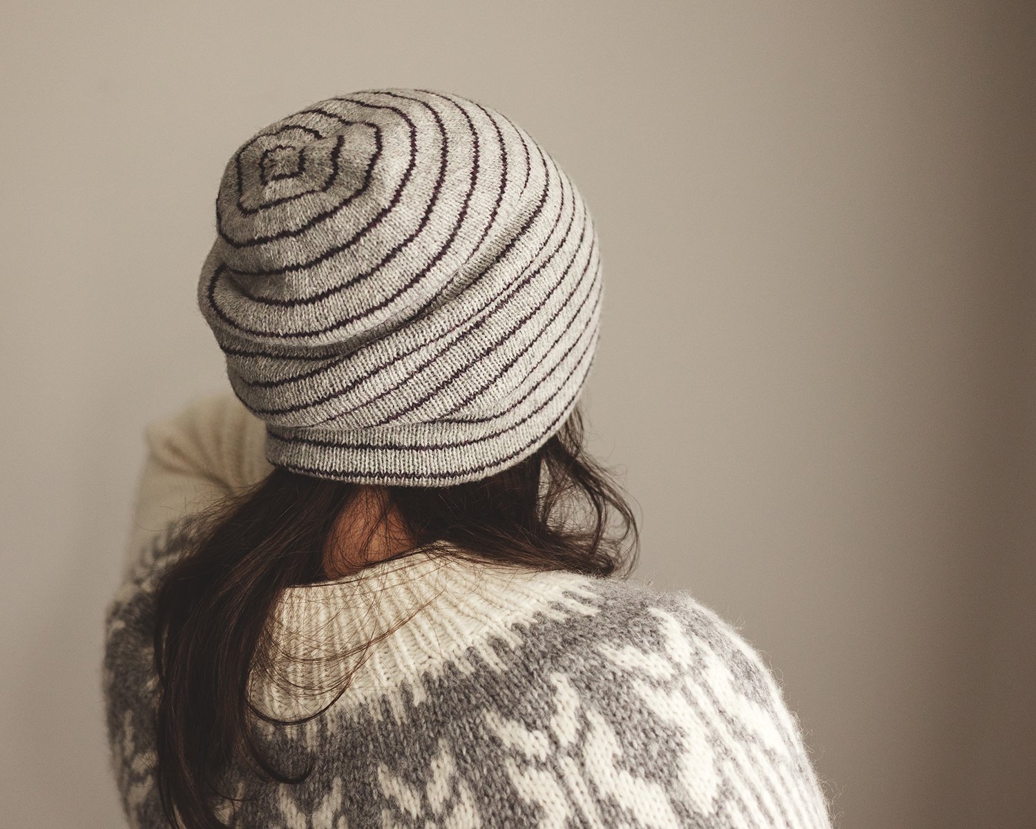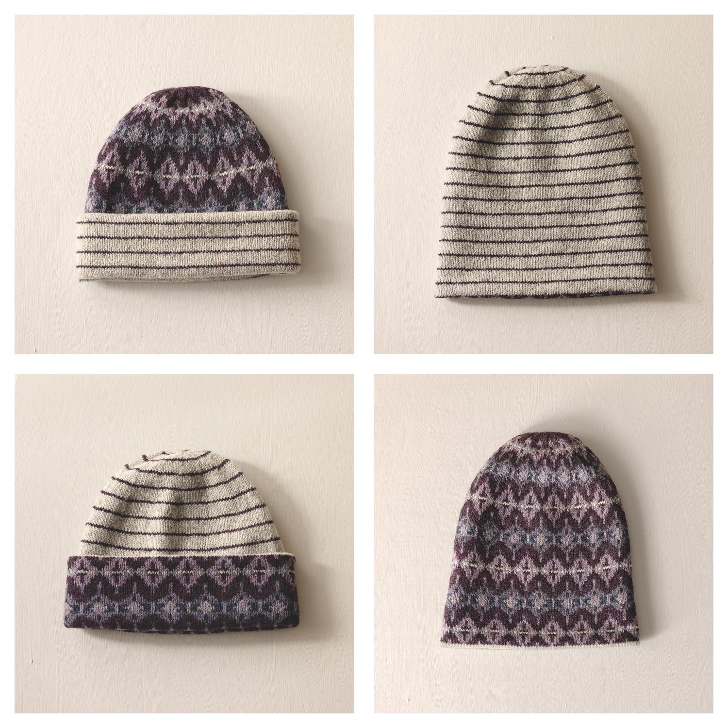 The Old Compass hat is worked from the brim up in the round in two directions, knit as a long tube in two different patterns, each finished with its respective crown.