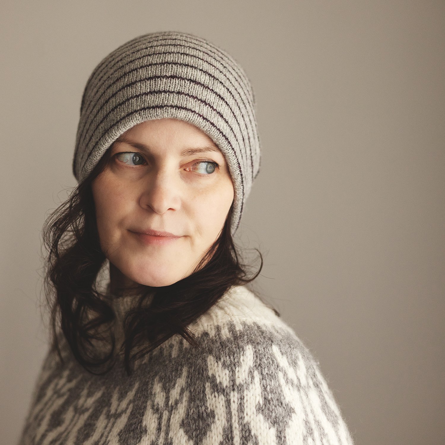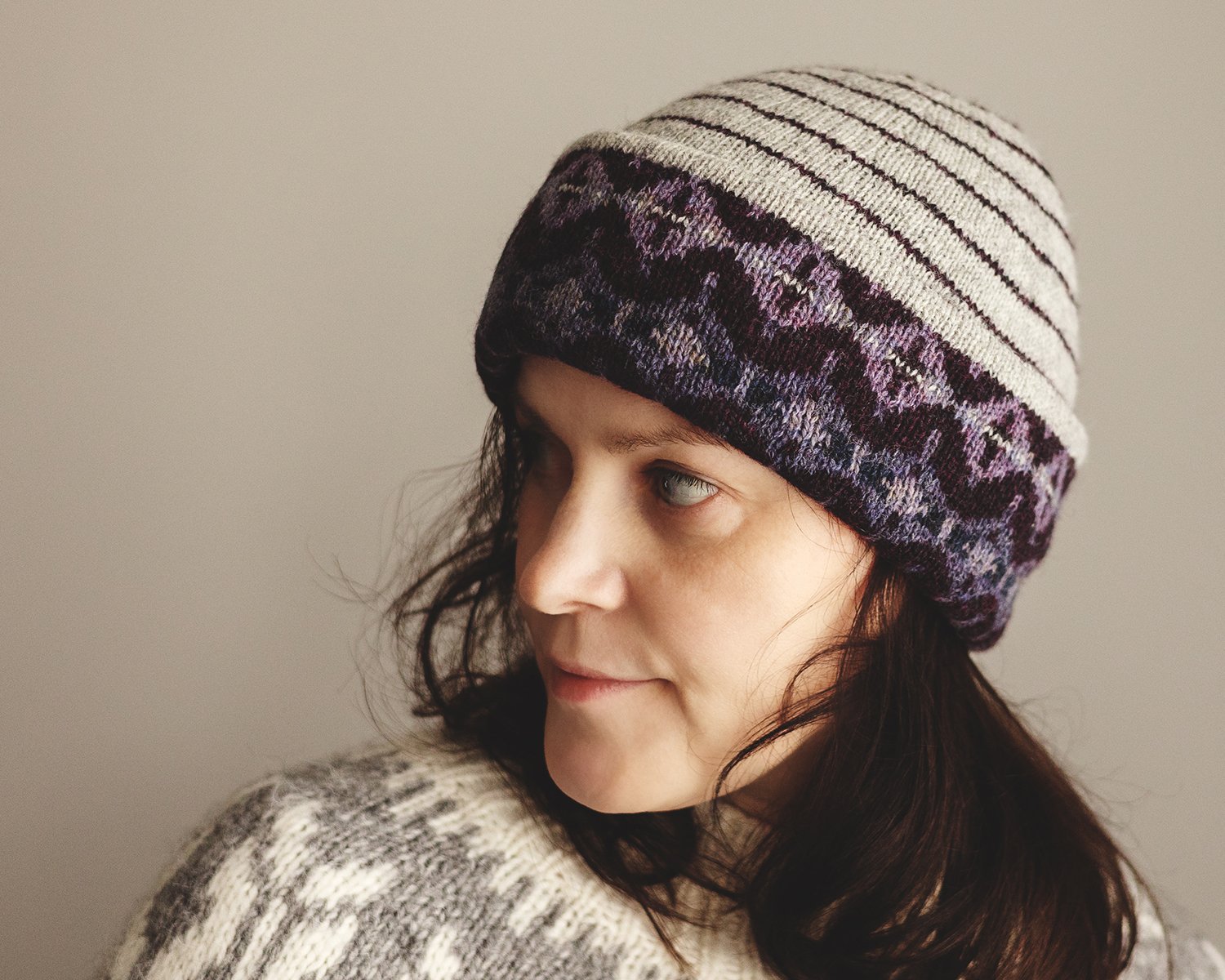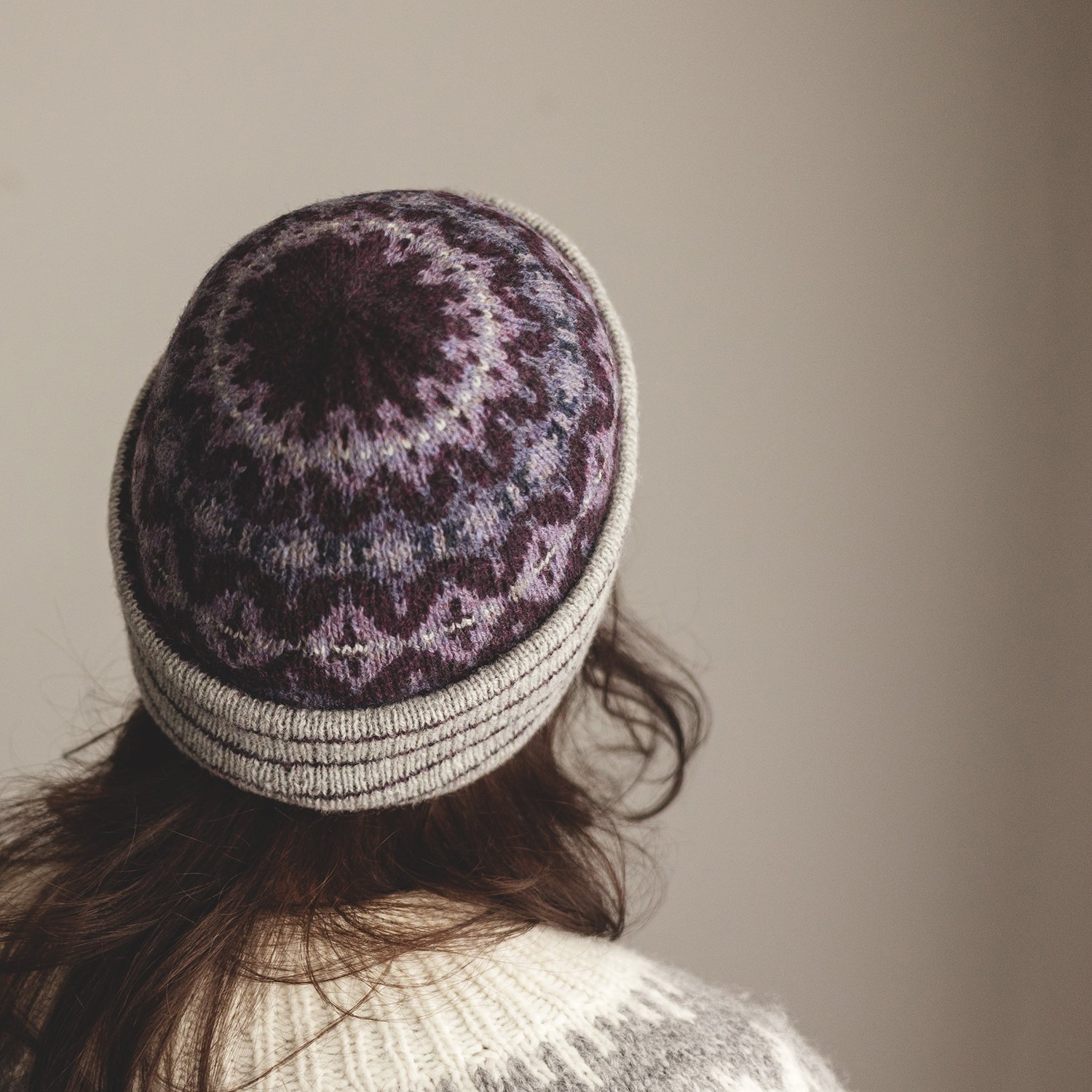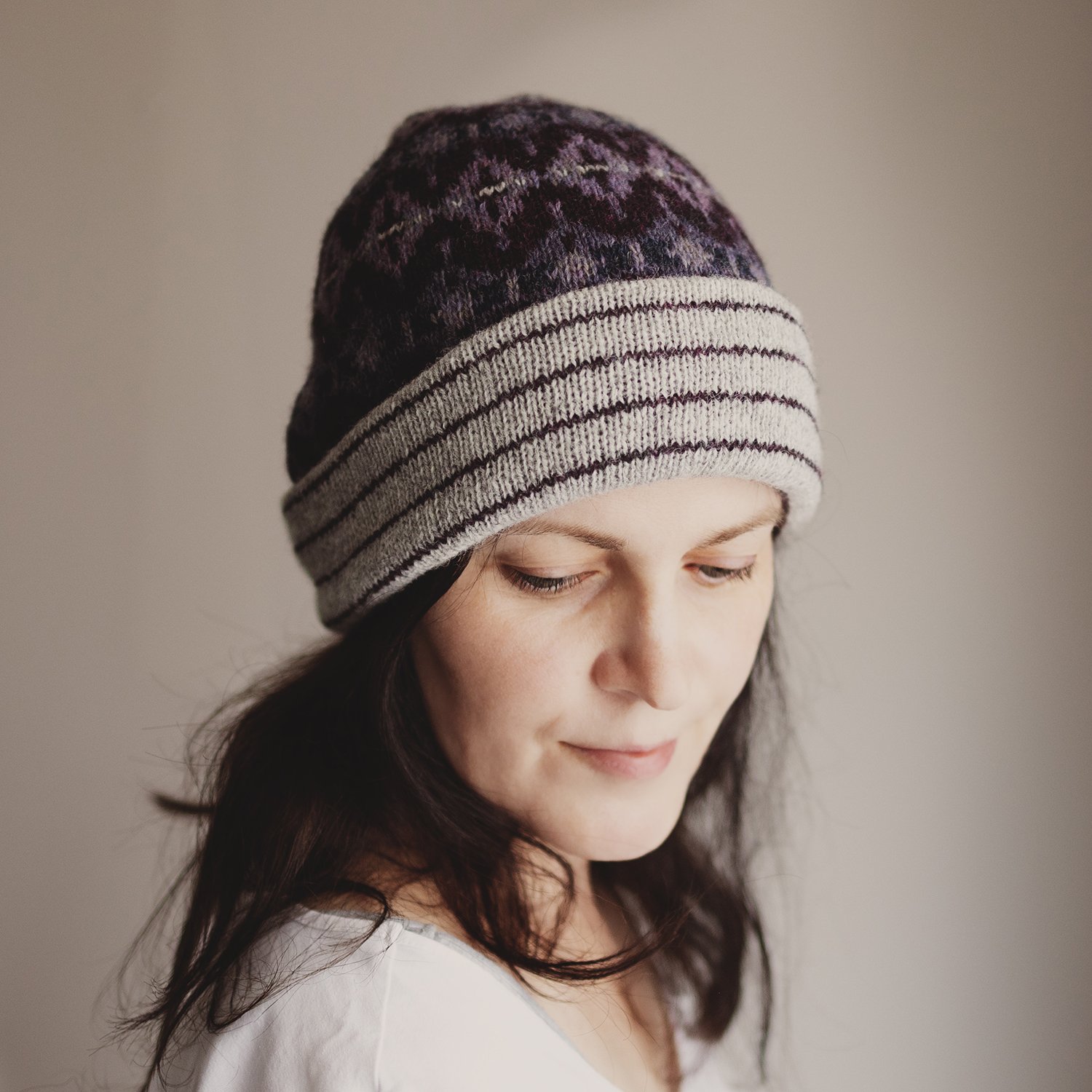 This hat is, after the cowl and the sweater, the third piece in the Old Compass collection. Same as the cowl, it is double-sided and reversible. One side with the beautiful, “all-over” colorwork, and the other side with simple stripes. This will give you quite a few options on how to wear the hat, either one or the other side, or both visible with the bottom folded for some extra warmth.