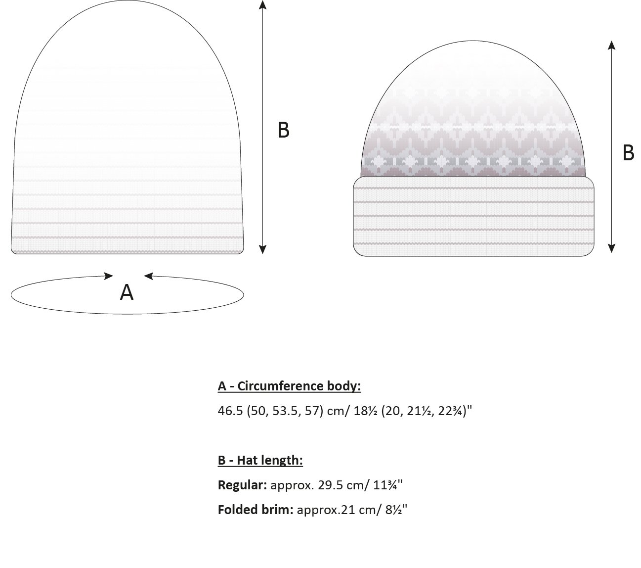 28 sts and 42 rnds in stockinette, and 28 sts and 34 rnds in CW = 10 cm/4” on the respective needle size, worked in the round (blocked).