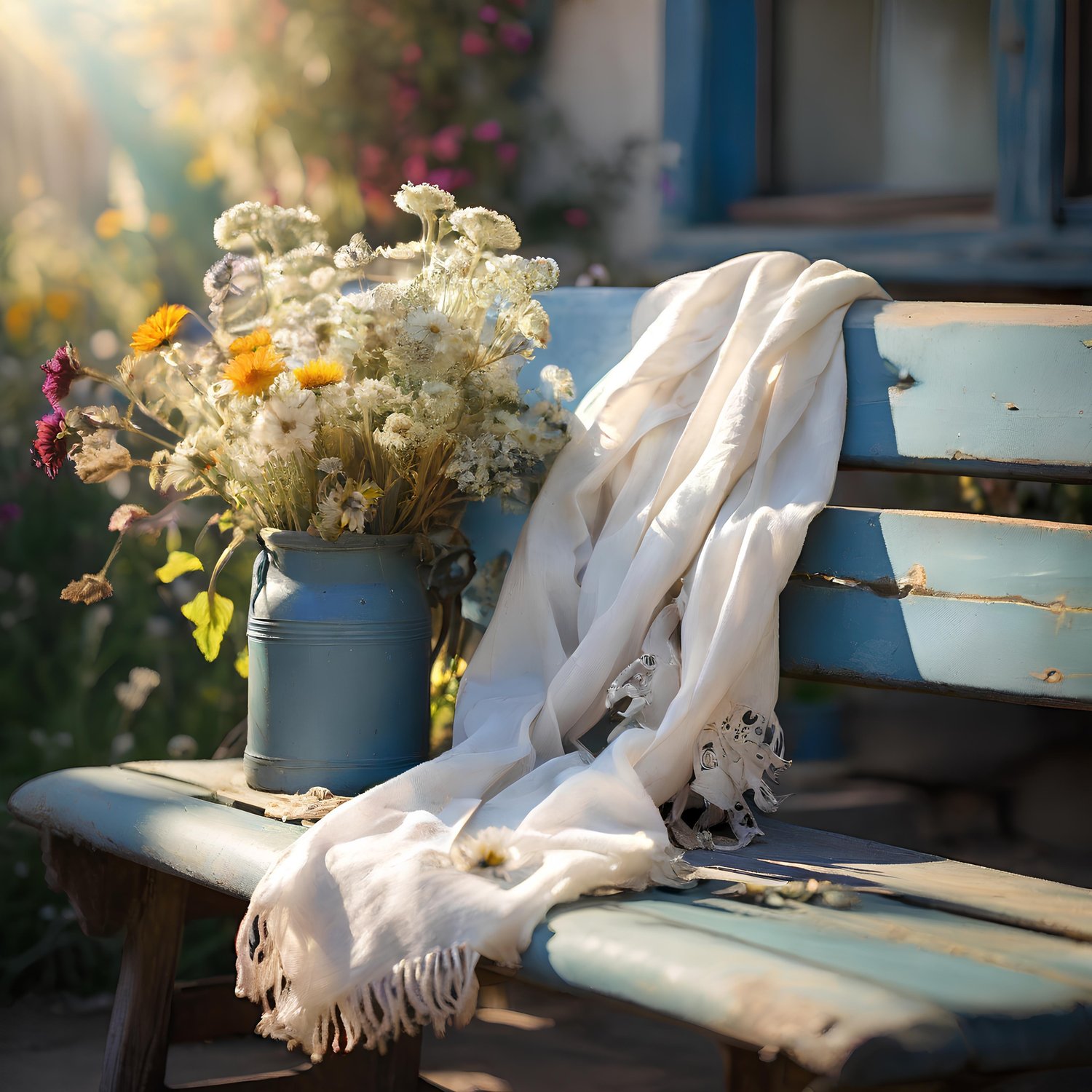 Old bench with scarf, wildflowers,sunlight