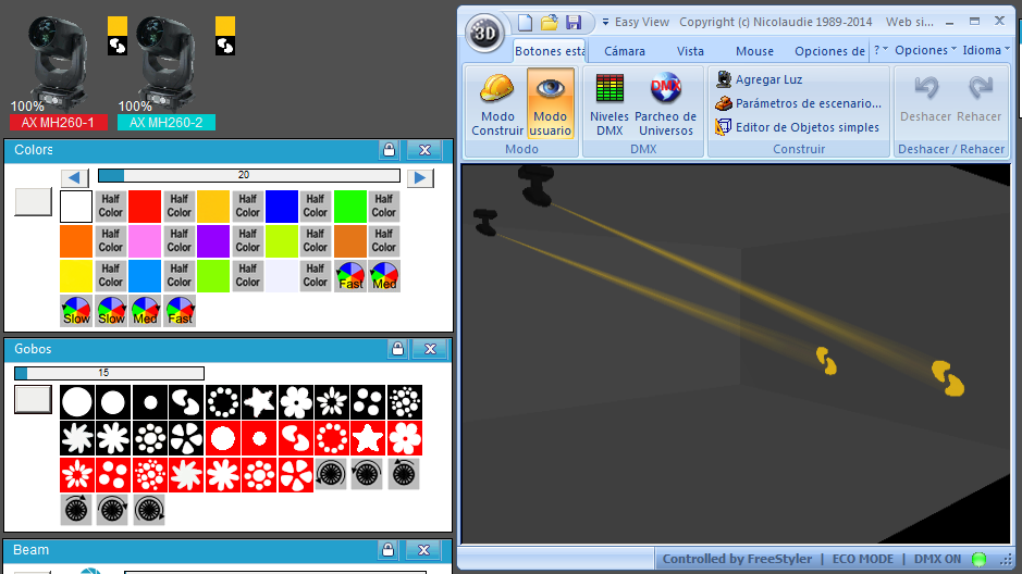 - Esta librería NO reemplaza al Fixture de Freestyler o QLC+, sólo es para ver la representación 3D. Es decir, HAY QUE TENER YA EL FIXTURE DE FREESTYLER o de QLC+ para controlar el equipo real.