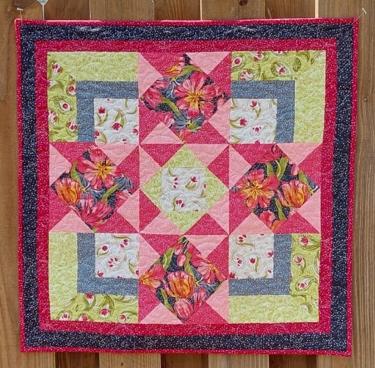 You have several options for this little quilt. The center can be a Square-in-a-Square surrounded by QSTs. Or you can make another of the on-point squares surrounded by QSTs. Or you can simply use a square of fabric. You can make all of the squares from the same fabric, or two or three fabrics. You can fussy cut those squares…or not. The choice is yours!