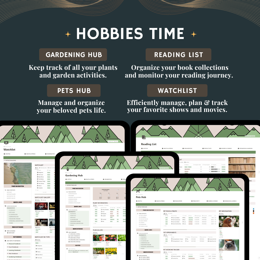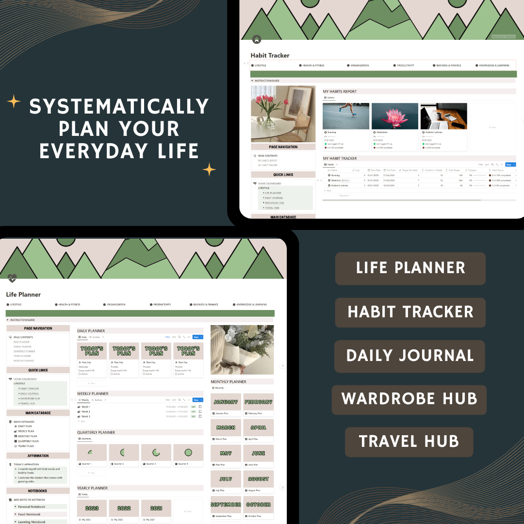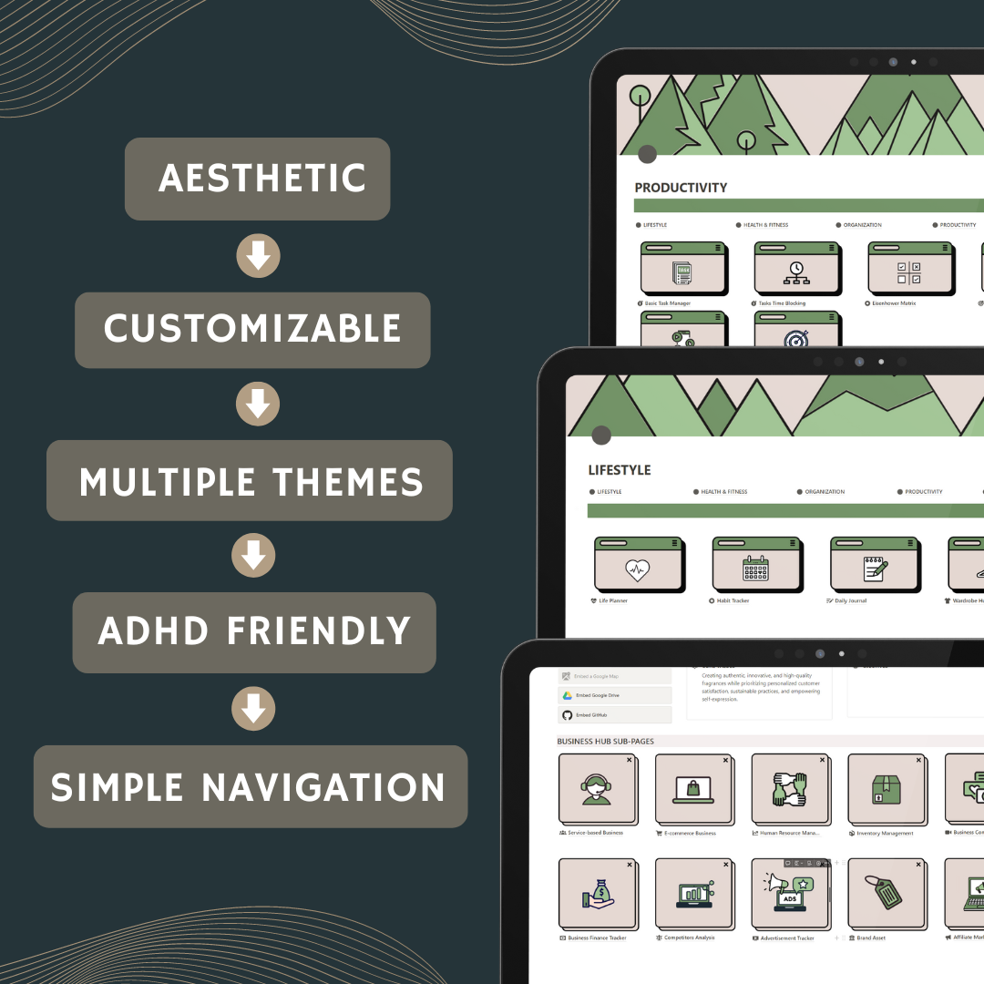 Ultimate All in Brown & Green Aesthetic Notion Template, Digitally Organize Every Aspect of Your Life