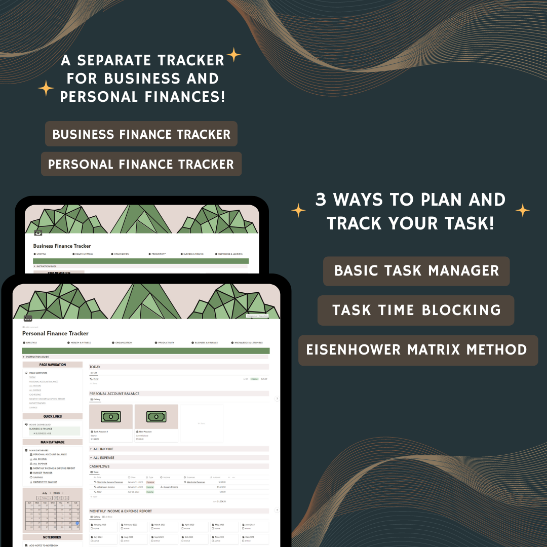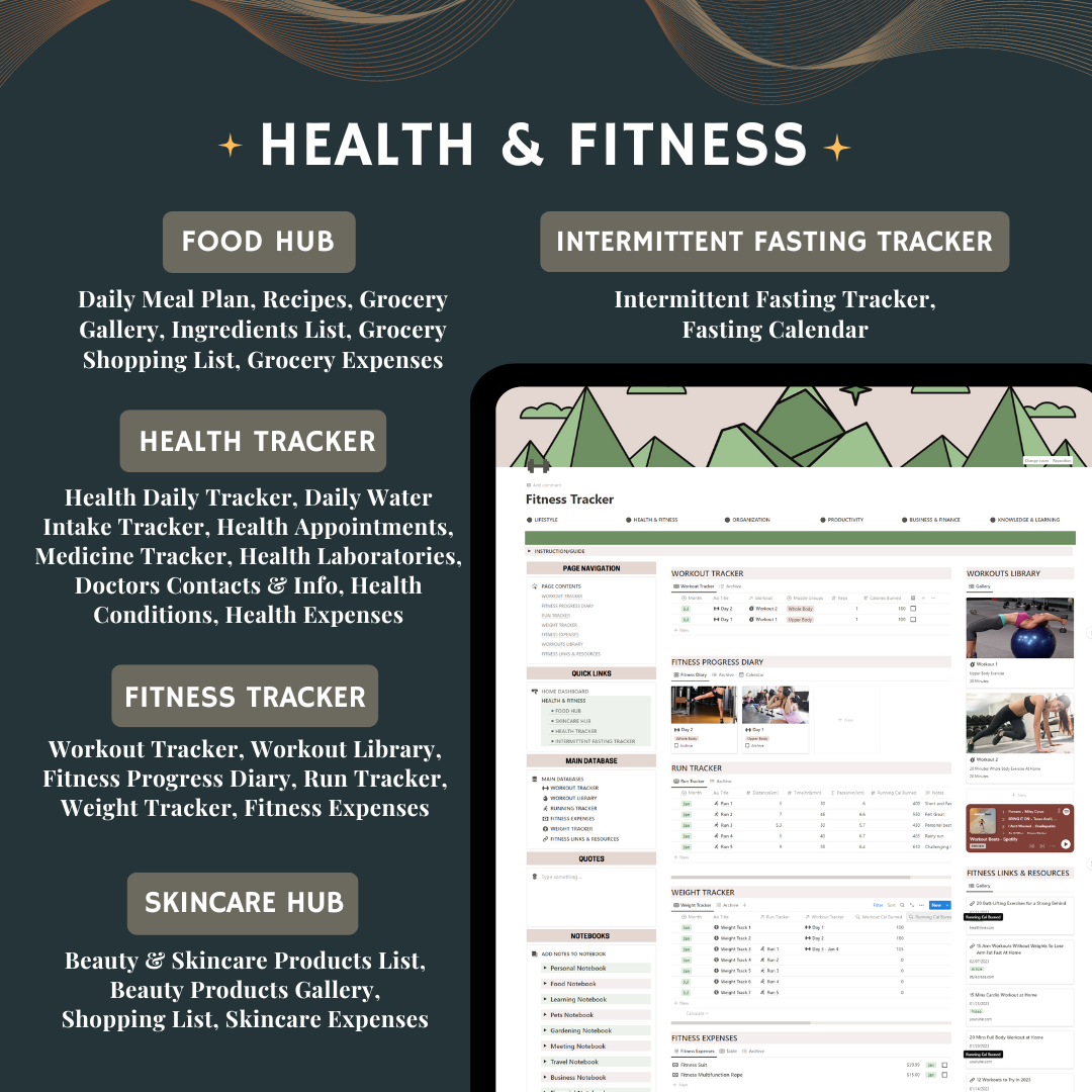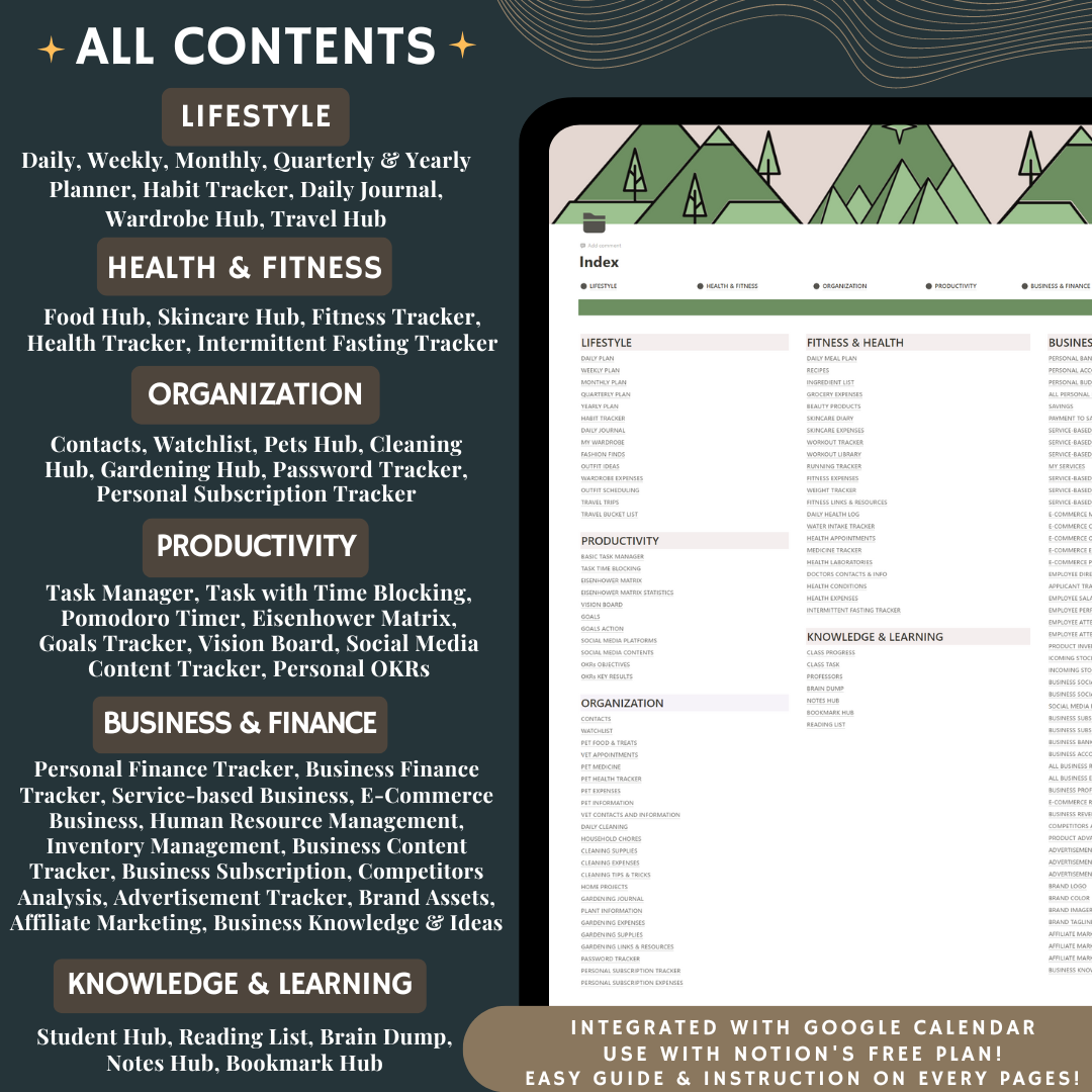 Ultimate All in Brown & Green Aesthetic Notion Template, Digitally Organize Every Aspect of Your Life