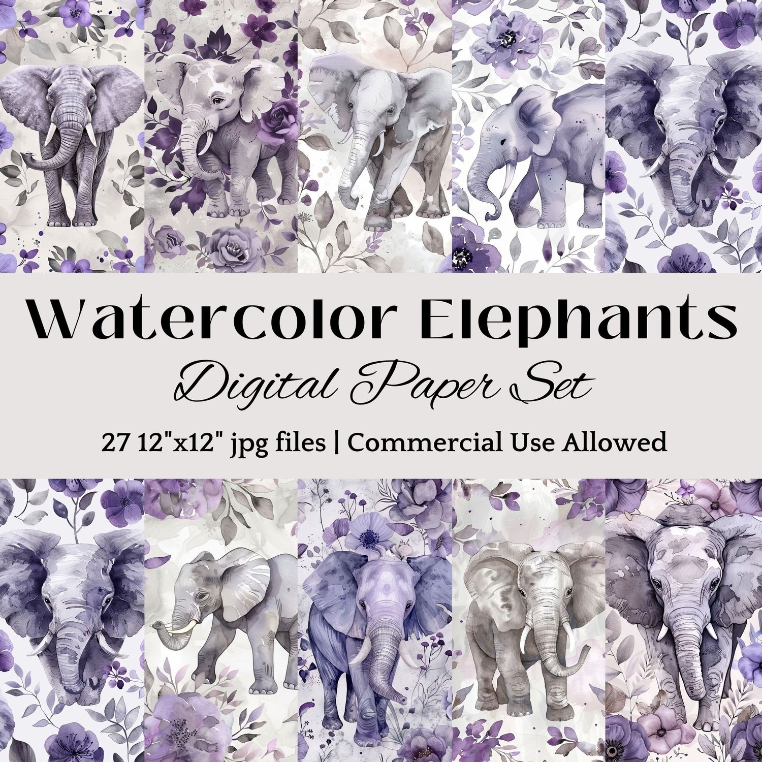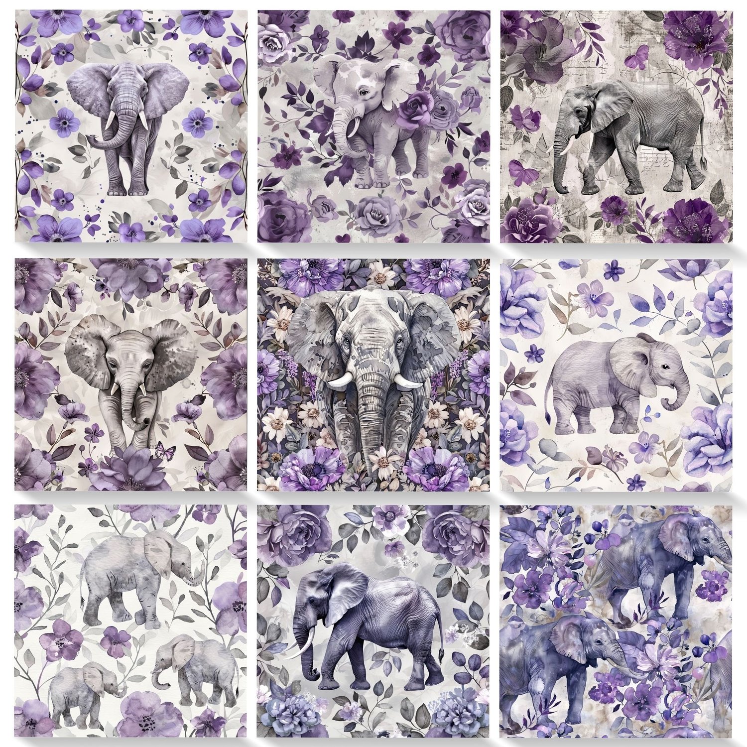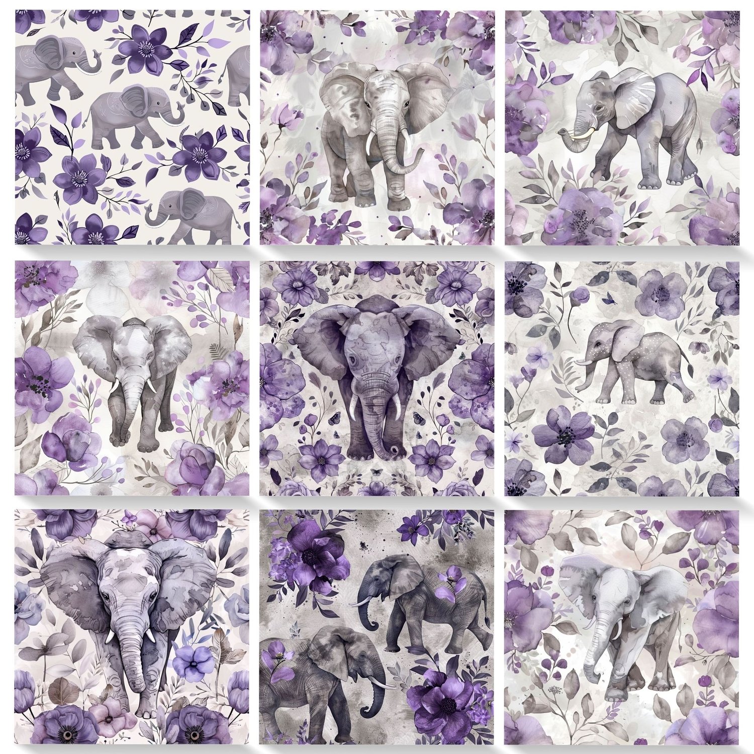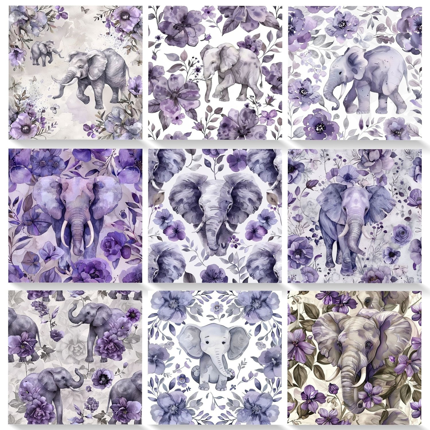 🐘 Watercolor Elephant + Purple Flowers Digital Paper Set 🐘