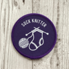 The patches feature a sock on the needles, with a yarn ball coming from the stitches, and the slogan 'SOCK KNITTER' above the design. The patches are woven, with a stitched edge, and the design is added in vinyl. They are hand-pressed in the UK by ErisApple.