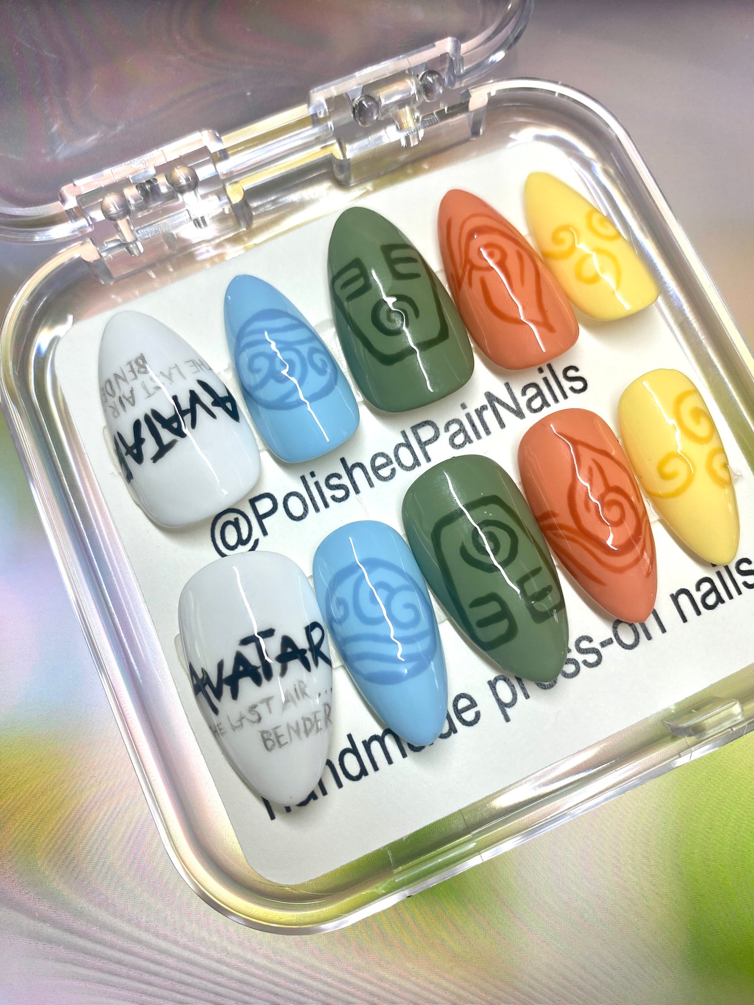 Ready to bend your style? 🔥 💧 ⛰️ 💨 These hand-painted press-on nails capture the magic of Avatar: The Last Airbender! Made with durable and reusable Gel-X, they're perfect for showing off your fandom. This set features iconic symbols and colors, but we can customize a set with your favorite characters or elemental designs! Let us create your perfect Avatar nail set.
