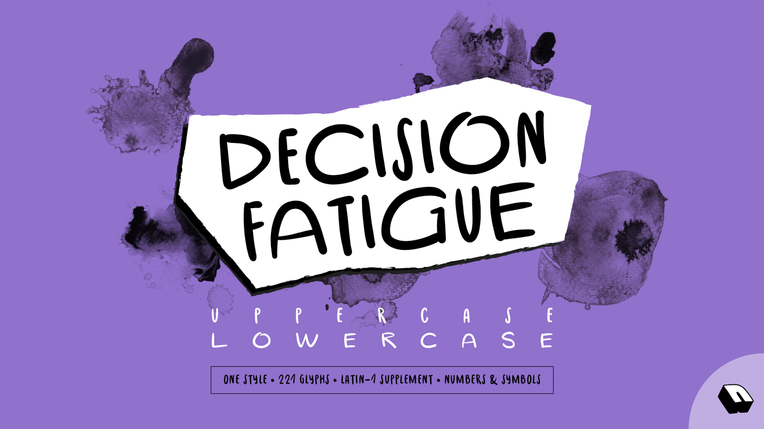 Decision Fatigue is an all-caps brush font for when your brain says no, but your project says go. Built on jittery energy and uneven momentum, it features two alternate sets: because uppercase and lowercase letters each come with a different width. Swap them out mid-word for that barely-holding-it-together charm.