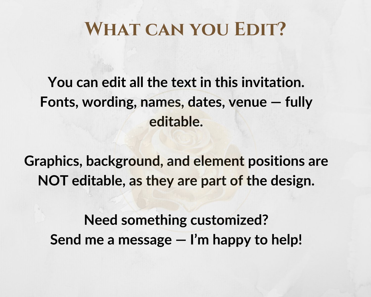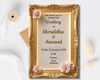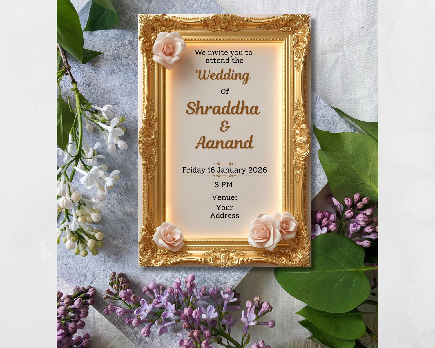 This editable wedding invitation card features an ornate gold frame, soft floral accents, and a classic royal aesthetic—perfect for Indian weddings, Hindu weddings, traditional ceremonies, receptions, engagements, and anniversary celebrations.