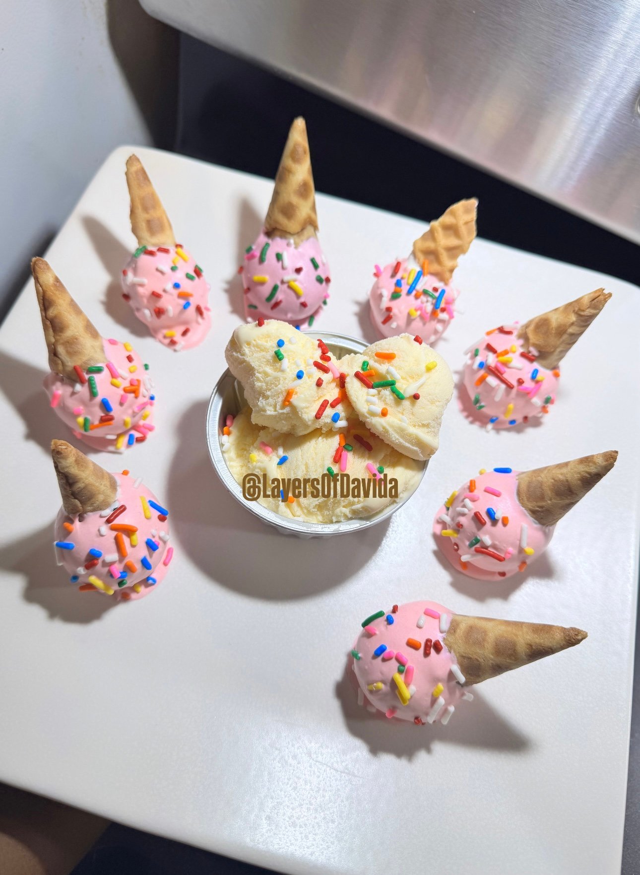 Ingredients: Vanilla cake, frosting, white chocolate coating, sprinkles