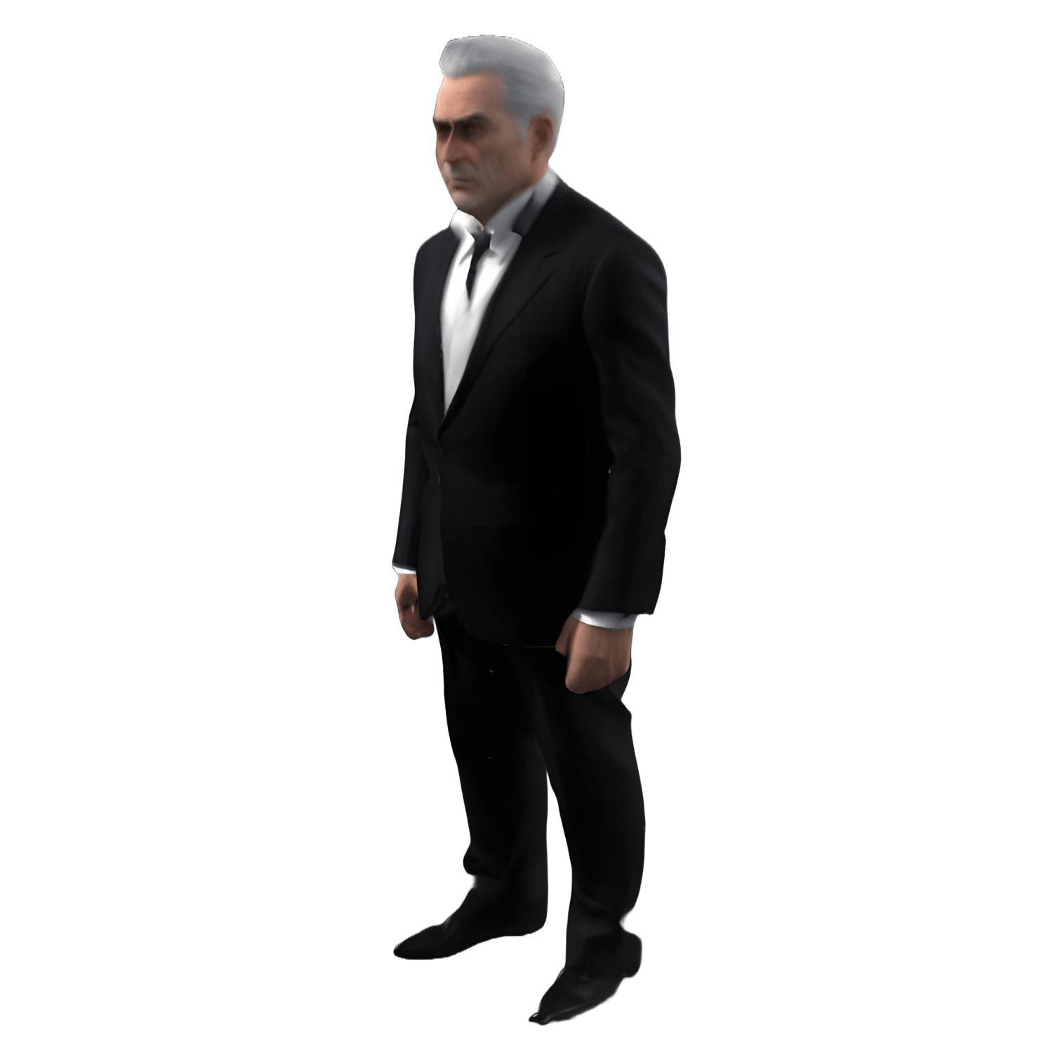 - A professional figure in a black suit with a formal stance