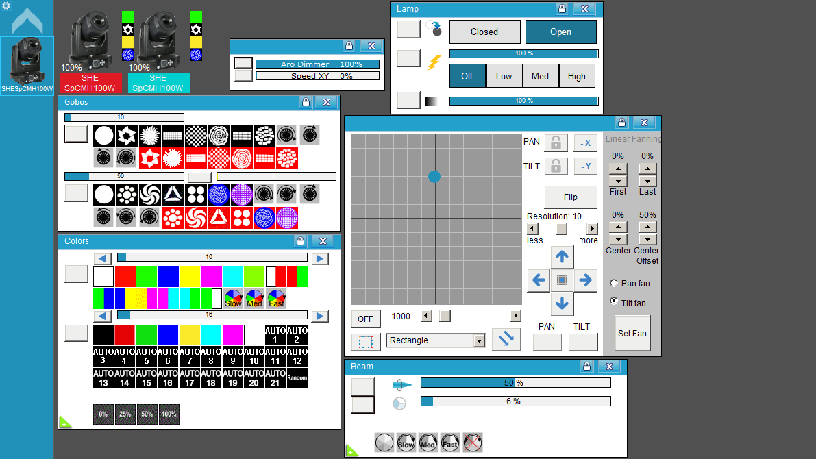 • Selección de 7 Gobos de la primer rueda (propios del equipo) + Open + Shake + Rotación de la rueda de Gobos.