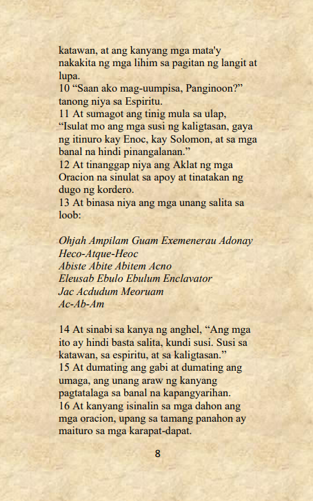 Bawat kabanata ay sumasalamin sa paglalakbay ng kaluluwa tungo sa kaliwanagan, at bawat oracion ay isang susi sa espiritwal na proteksyon, paglilinis, at paghuhubog ng loob. Ang aklat na ito ay isang mistikong salamin ng digmaan sa pagitan ng liwanag at dilim, at panawagan sa mga “hinirang” upang gampanan ang kanilang tungkulin sa dakilang plano ng sansinukob.