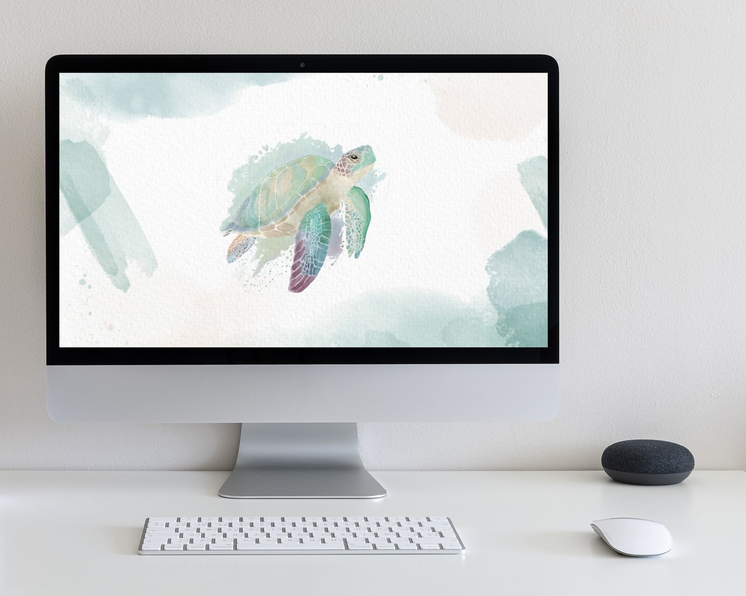 Featuring a marine turtle illustration in a soft digital watercolor style, this artwork is perfect for anyone who wants to add a touch of calm and creativity to their screen while keeping it neutral and elegant.