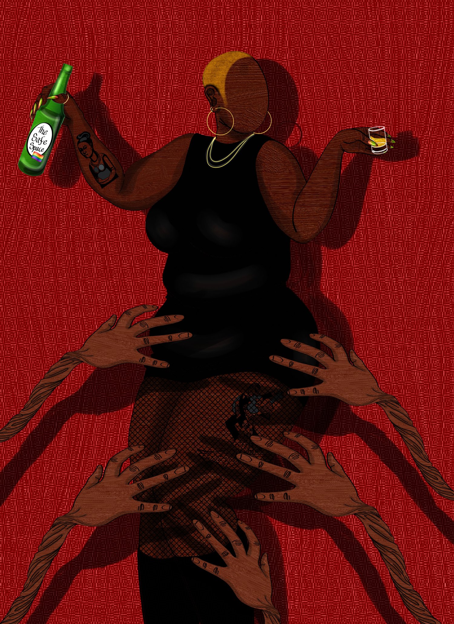 Marginalization often entails having limited access to safety. Limited access to places where you can be your whole self without persecution, ostracization, or threats of and actual violence. This necessitates the cultivation of spaces specifically created to offer safety, solidarity, and community. A lot of these spaces dub themselves or are deemed ‘safe spaces’. Spaces that are exclusive or explicitly welcoming to people marginalized through race, gender, sexuality, disability and/or class. Spaces that promise a reprieve from the isolation and hardship that is often resultant from marginalization. In ‘pour out libations’ I have created a work that conveys the complicated experience of being in a safe space and encountering predation. In it, the lone figure can be seen dancing and holding up alcoholic beverages, one of which contains the branding of the safe space they are in. A space that is specifically geared toward cultivating safety for queer people. The work also includes twisted hands reaching for the dancing figure in an ominous way. The hands represent members of our community whose choices and actions pose a threat to the people they are in proximity to.