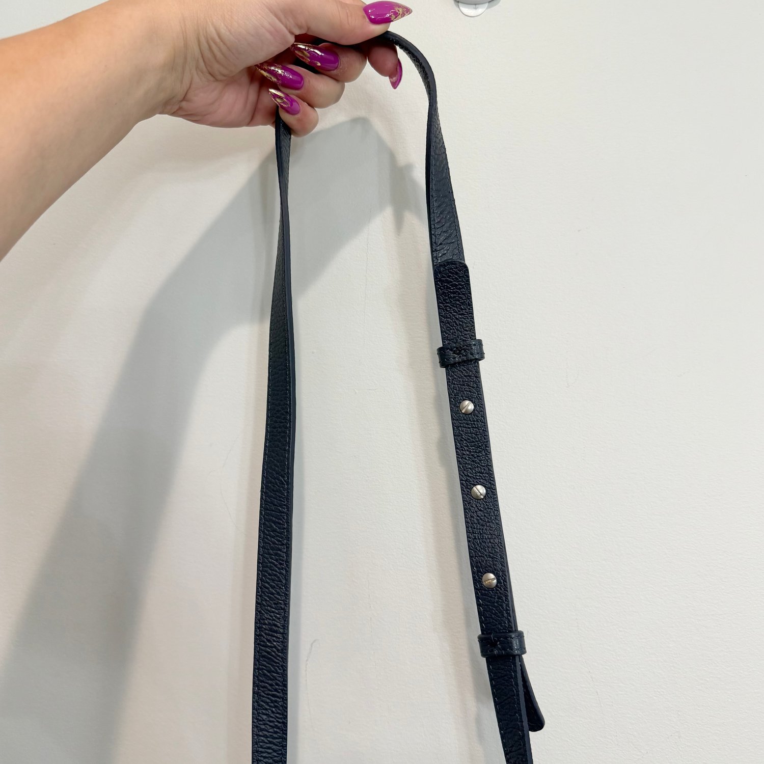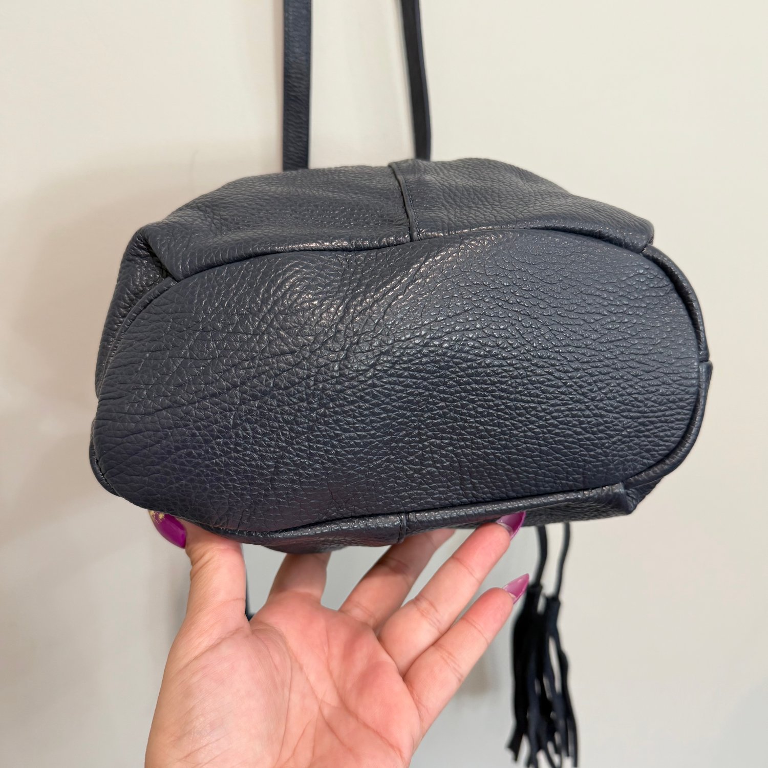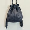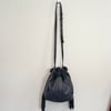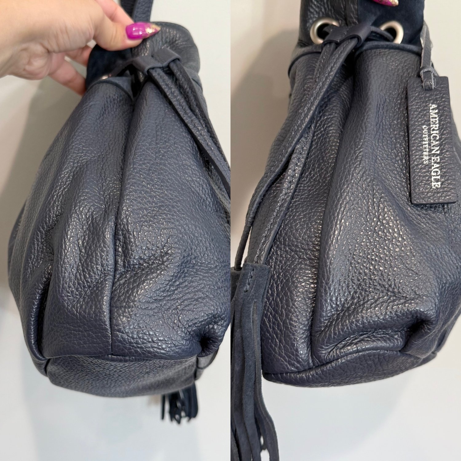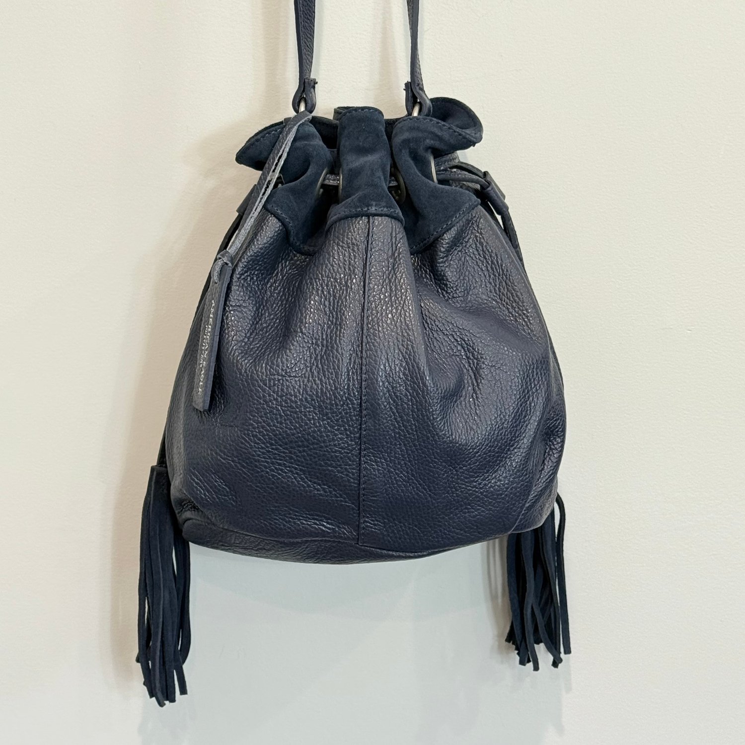 American Eagle dark blue pebbled leather and suede drawstring bucket crossbody bag with silver tone hardware and a slightly adjustable strap but not removable crossbody strap. Drawstring with tassel closure as well as a snap magnet to the interior which has the branding on one side and two slip pockets on the other side.