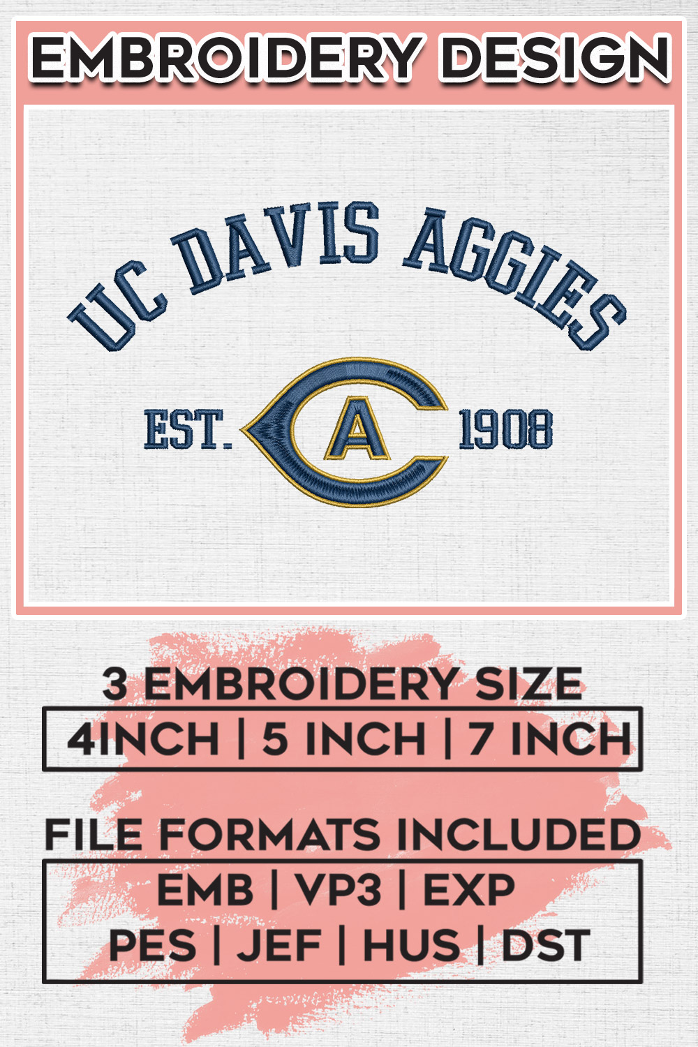 NCAA UC Davis Team Est Logo Embroidery Files, NCAA UC Davis Aggie Football Team Embroidery, NCAA Teams, Game Days, Machine embroidery designs, Digital Download
