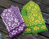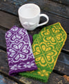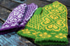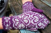 Stranded mittens inspired by traditional Norwegian ‘Selbu’ mittens. The main motif on these mittens resemble Norwegian waffles (vaffel). A picot cuff gives the mittens a feminine look.
