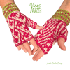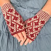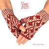 The Vines fingerless mitts are knitted in rounds, in mosaic knitting. The vine pattern wraps around the hand from the palm, over the top of the hand to the thumb. A diagonally patterned wedge on the palm makes the pattern easily adjustable in width. The beginning of the round is at the palm, between the vine pattern and the wedge.