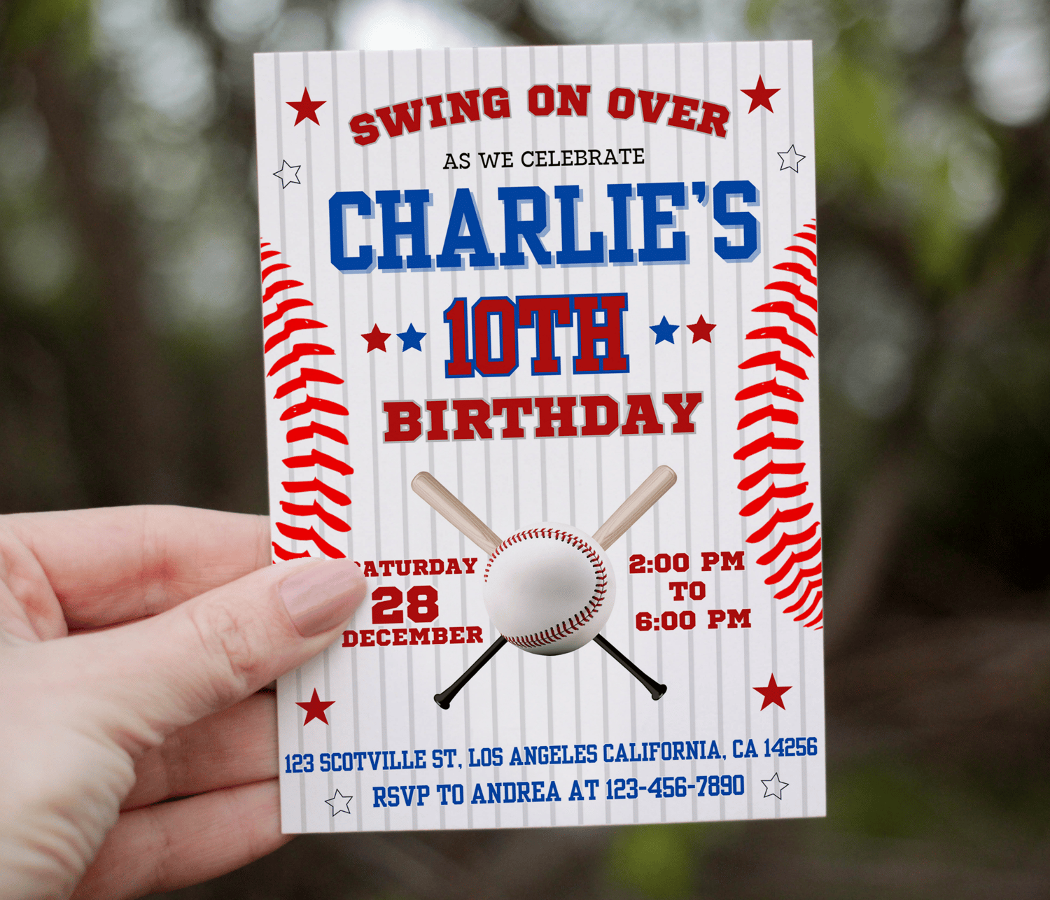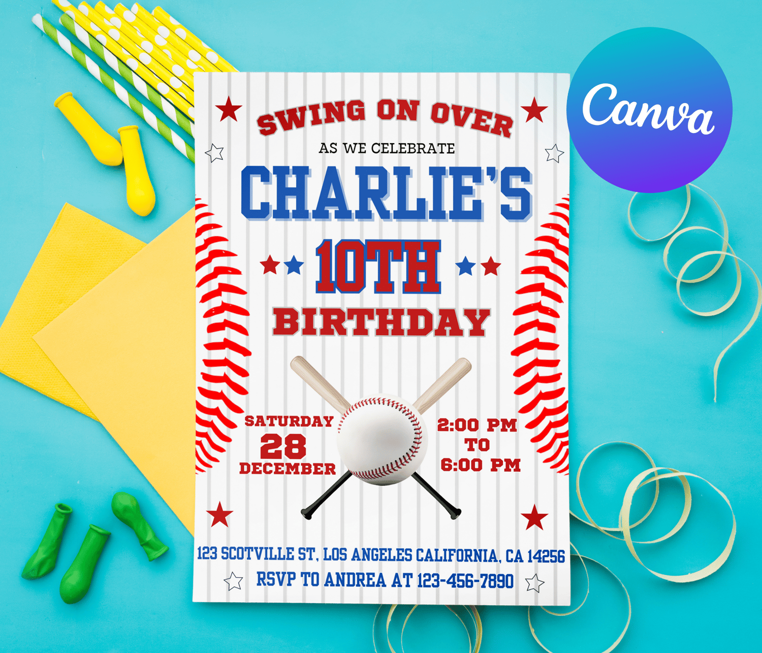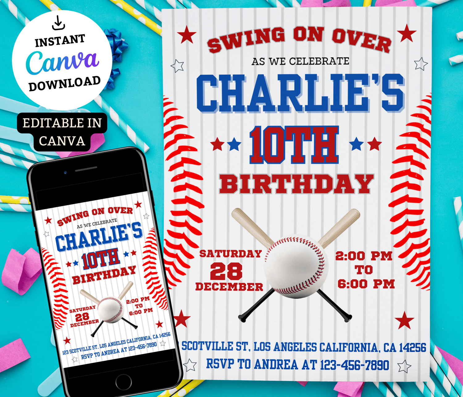 Editable Baseball Birthday Invitation, Baseball Invites, Instant Download Baseball Invitations, Digital File, navy blue red boy party invite