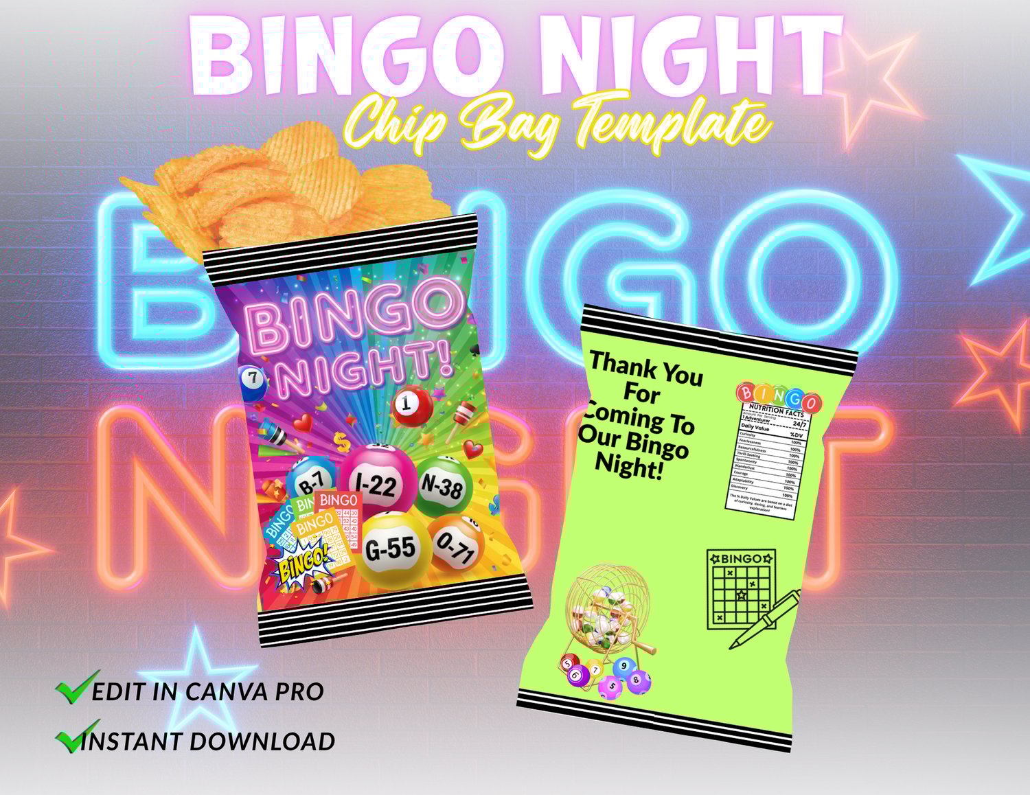 Bring the fun to your next Bingo Night party with this stylish and fully customizable chip bag template! Perfect for party favors, game night snacks, or themed events. This Editable Bingo Night Chip Bag Template is designed in Canva and features fixed Bingo Night artwork with room to add your own elements, colors, and text to match your event theme.