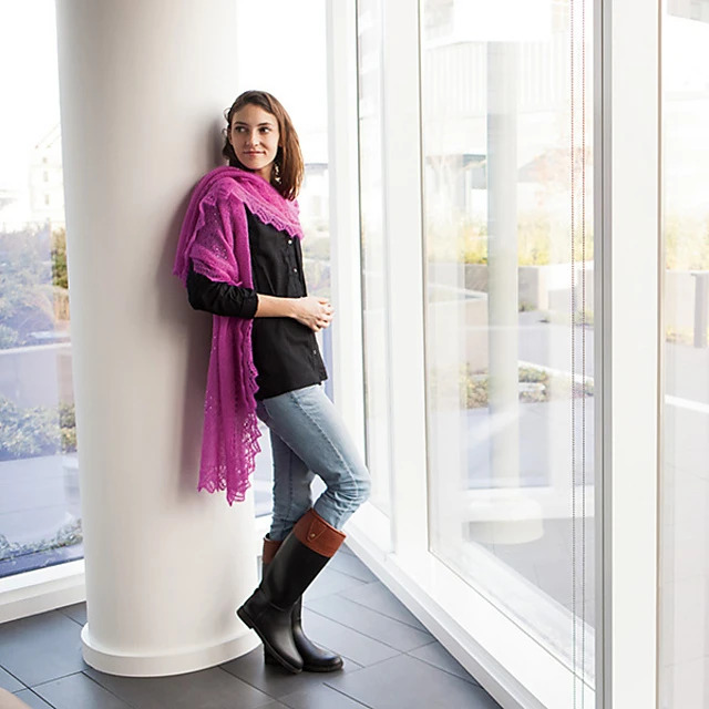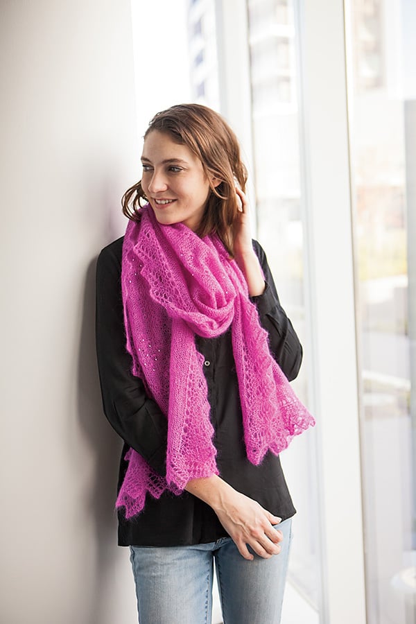 A little Mohair goes a long way with this lovely pink cloud. You’ll want to use every inch of the extra generous proportions to cacoon yourself in its marshmallow-soft textures, and you’ll have plenty of length to attractively drape your lace with a little fabulously studied nonchalance.