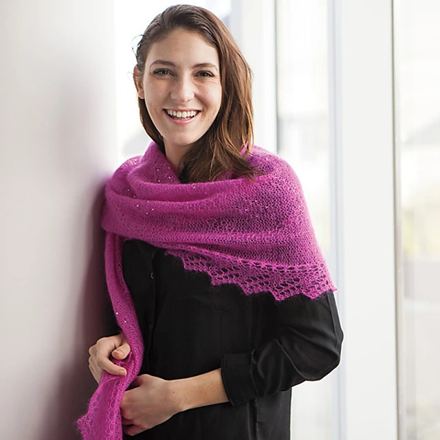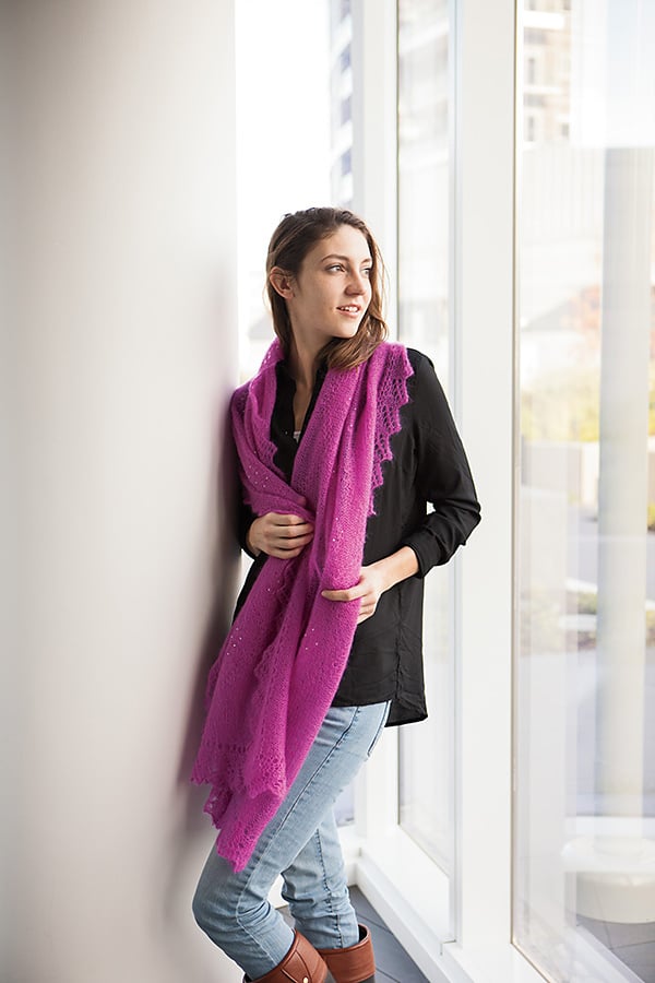 The Queensway Shawl is a rectangular shawl started with a provisional cast on, which is later picked up for the all-around lace edge. The unusual “tuck” stitches are used to create a diamond motif over a ground of reverse stockinette. Beads are placed to emphasize the tucked stitches.