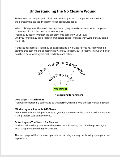 • The three emotional layers of the No-Closure Wound (attachment, self-blame, and the search for answers)
