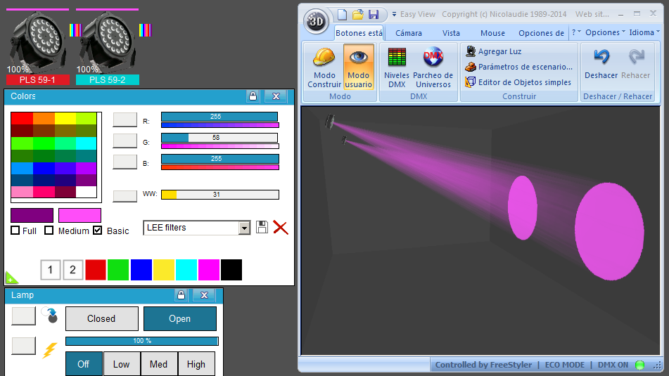 Esta Librería SSL2 está optimizada para trabajar con Magic 3d Easy View. Es decir para ver una representación 3D de las secuencias que estemos realizando con Freestyler, QLC+ o cualquier otro soft que se conecte con Magic 3d.