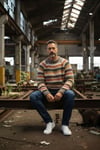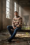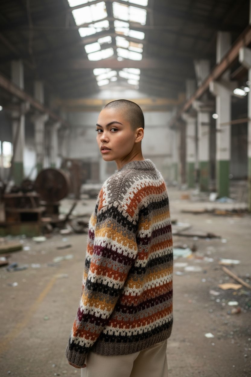 A sweater that tells a story. This handknitted Fair Isle-inspired pullover combines rich earthy stripes — rust, mustard, burgundy, charcoal, cream and grey — into a timeless pattern that feels both vintage and utterly modern. Made from a soft mohair blend, it has that irresistible fluffy halo texture that only handmade knitwear can offer.