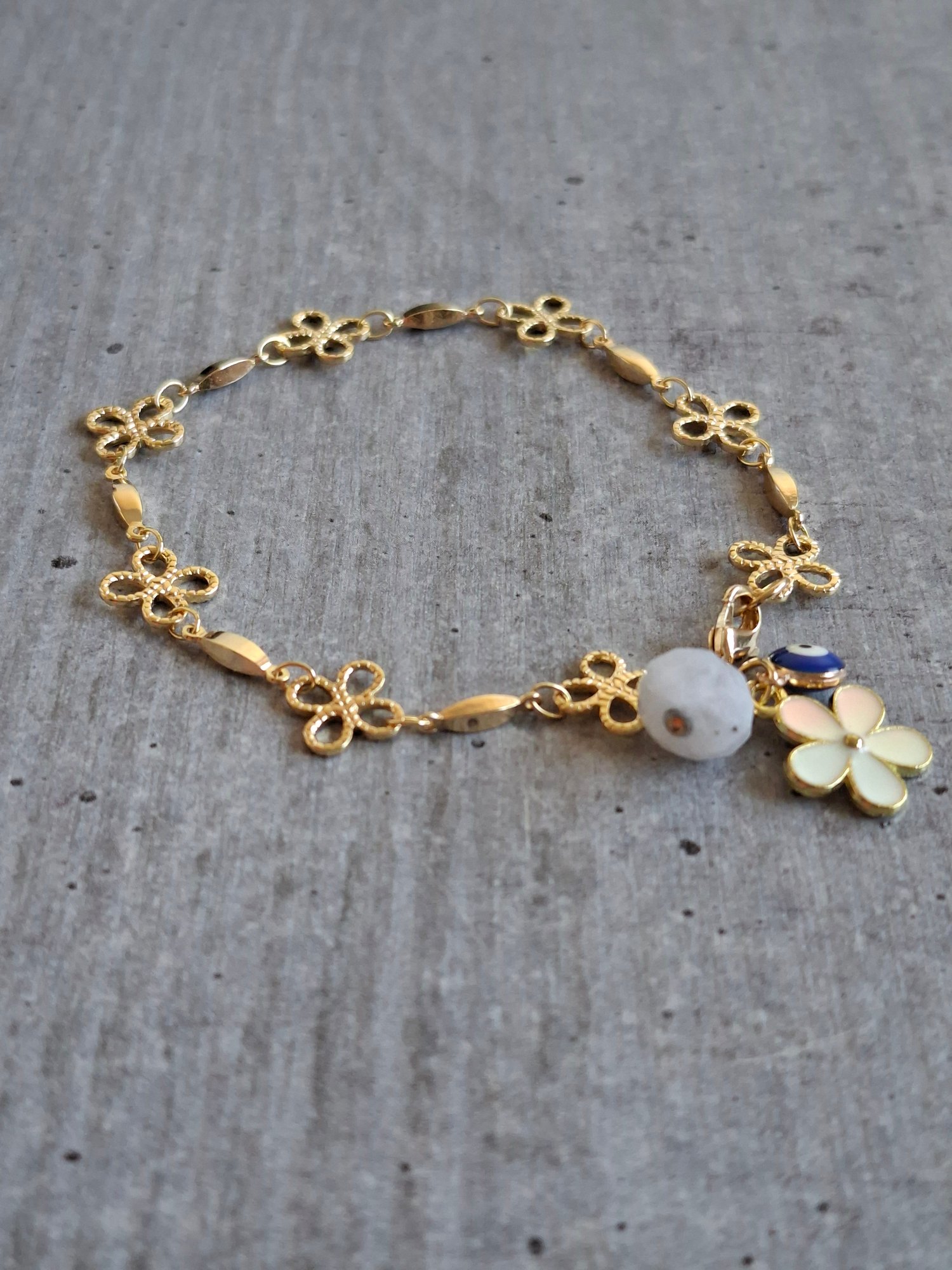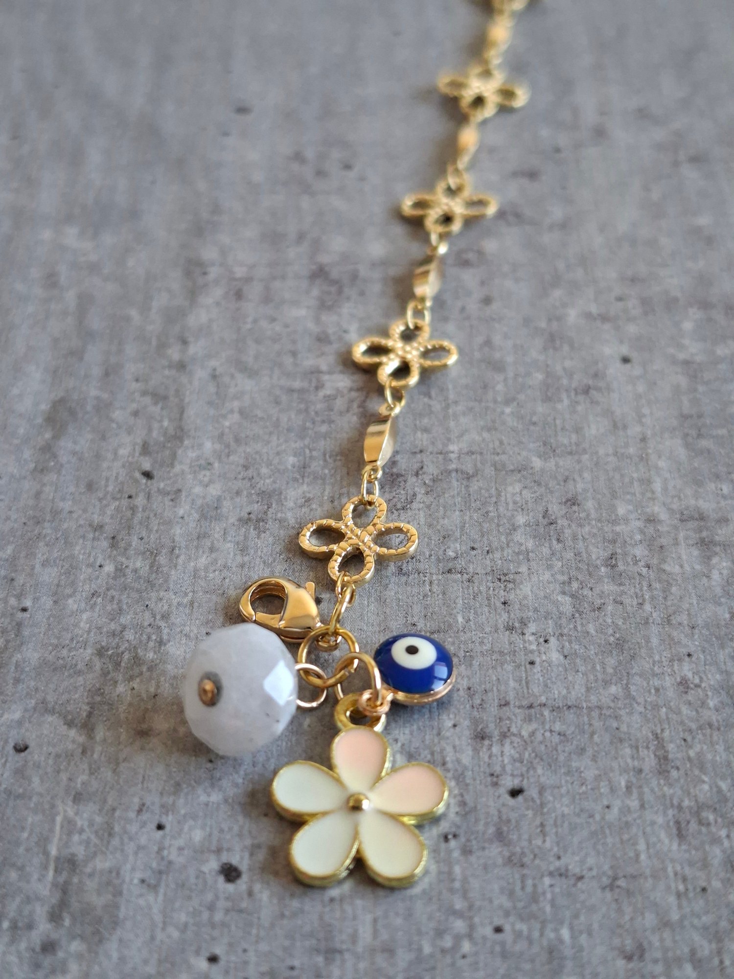 Un bracelet fin et poétique qui associe la délicatesse d’une chaîne dorée ajourée à des charms symboliques. Une fleur émaillée, une pierre de lune et un petit œil protecteur s’unissent pour créer un bijou raffiné et énergétique, porteur de douceur et de protection.