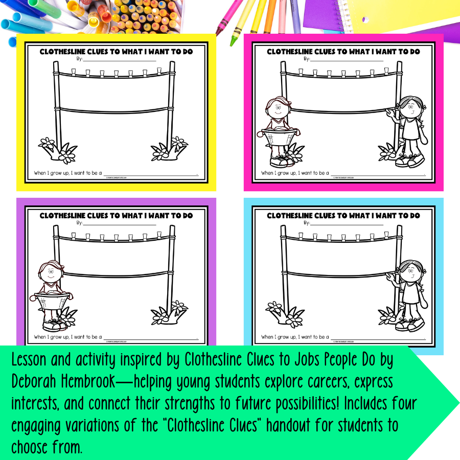 - "Clothesline Clues to What I Want to Do" Worksheet: Students draw and write clues about a job they’re interested in—combining creativity with personal reflection.