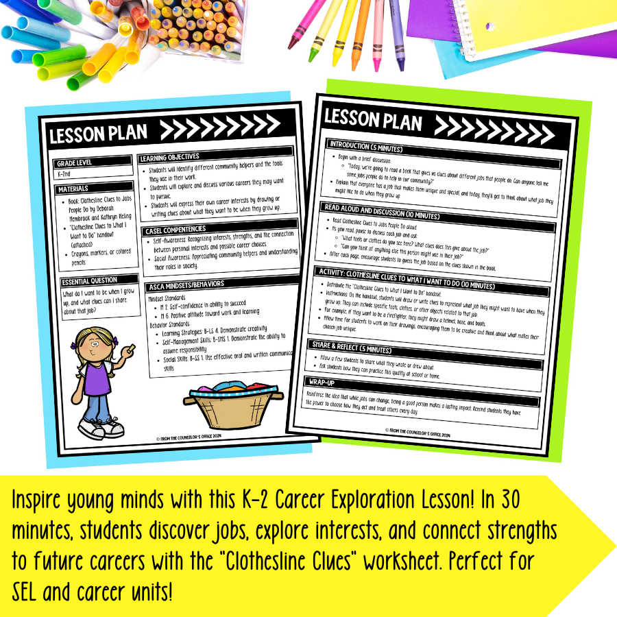 Help your youngest learners explore career possibilities in a fun and meaningful way with this ready-to-use, 30-minute lesson based on Clothesline Clues to Jobs People Do by Deborah Hembrook and Kathryn Heling. Designed for curious K–2 students, this lesson introduces a variety of community jobs while promoting self-awareness, social understanding, and creative thinking.
