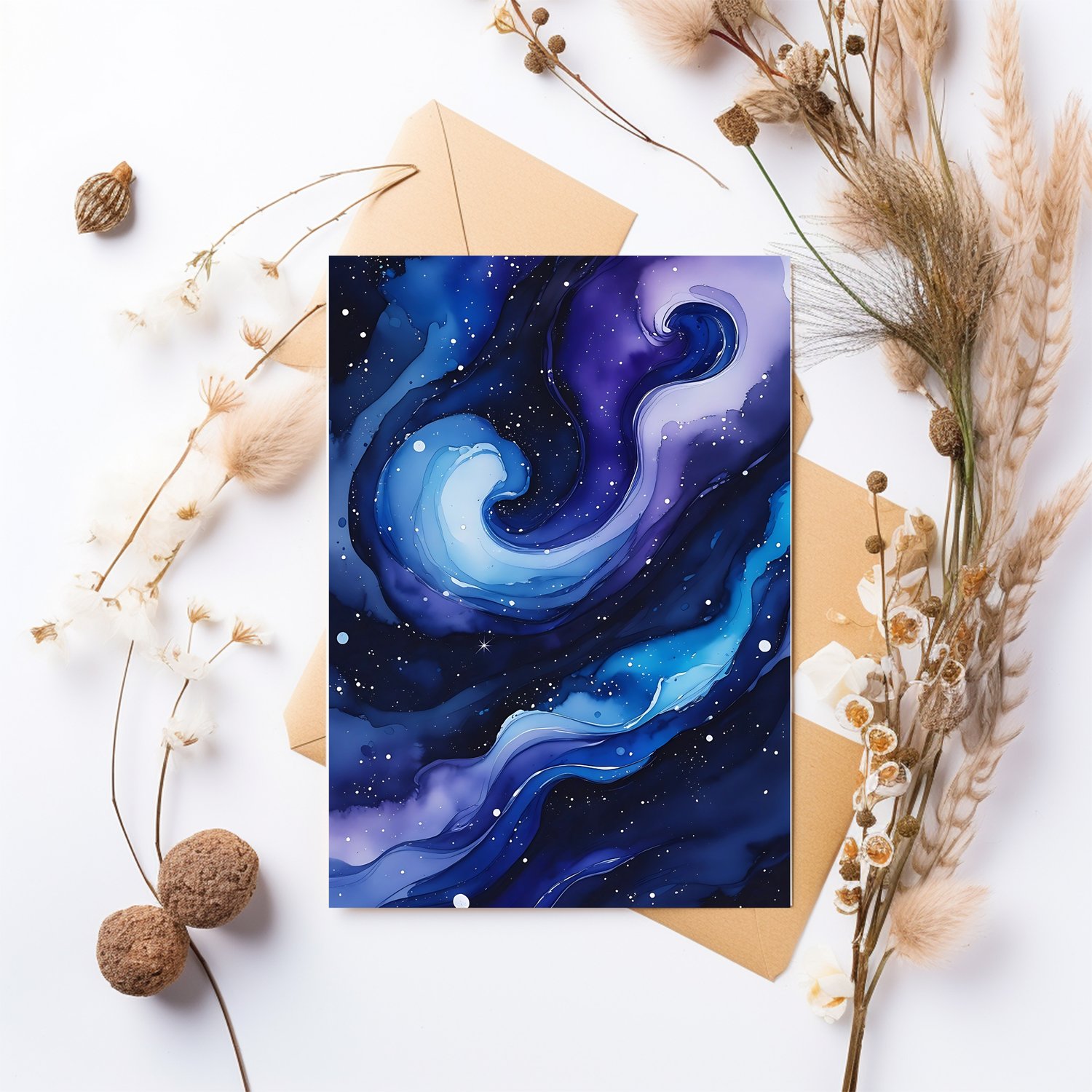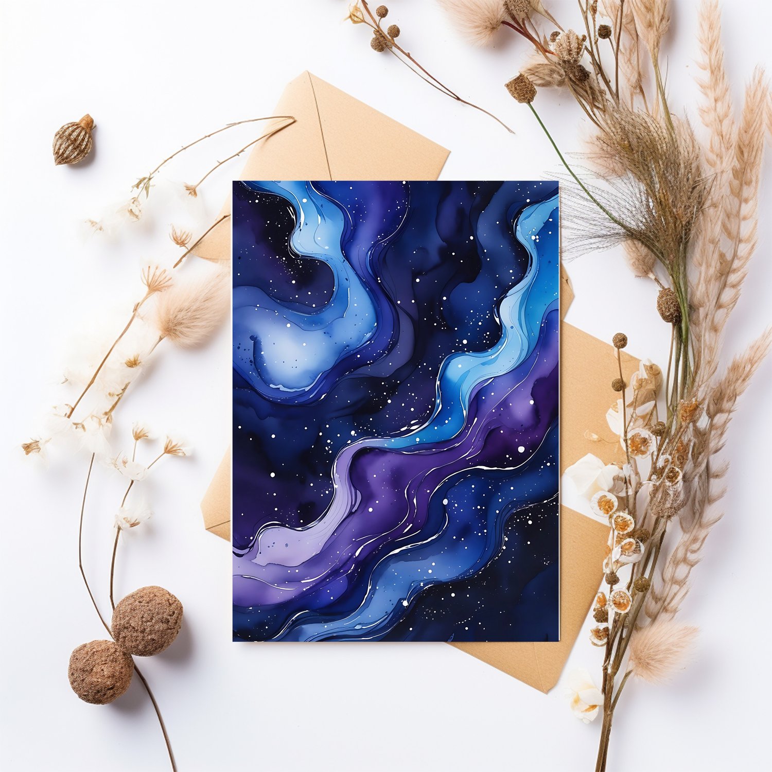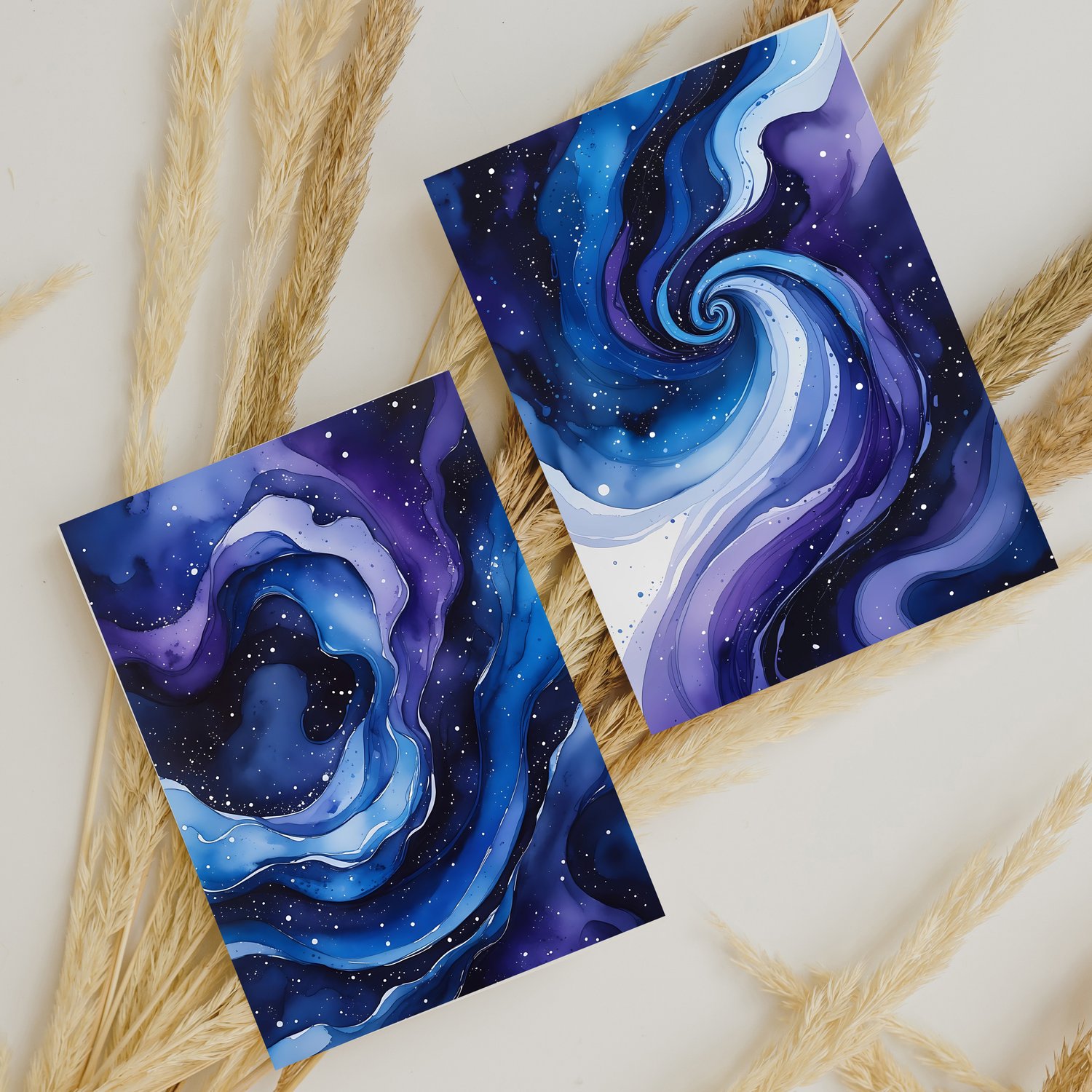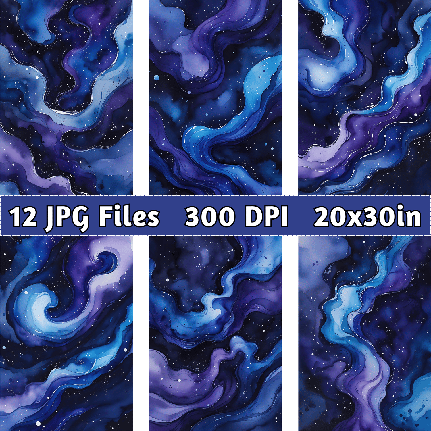 Immerse yourself in the beauty of the cosmos with this set of 12 high-quality abstract watercolor backgrounds. Inspired by the mesmerizing depths of the galaxy, these designs feature a fluid blend of deep indigo, royal purple, and cerulean blue. Delicate white speckles scatter across the rich, velvety backdrop, resembling distant stars, while organic water patterns and subtle transparency add a cosmic swirl effect. The result is a celestial, dreamlike aesthetic perfect for artistic and mystical projects.