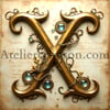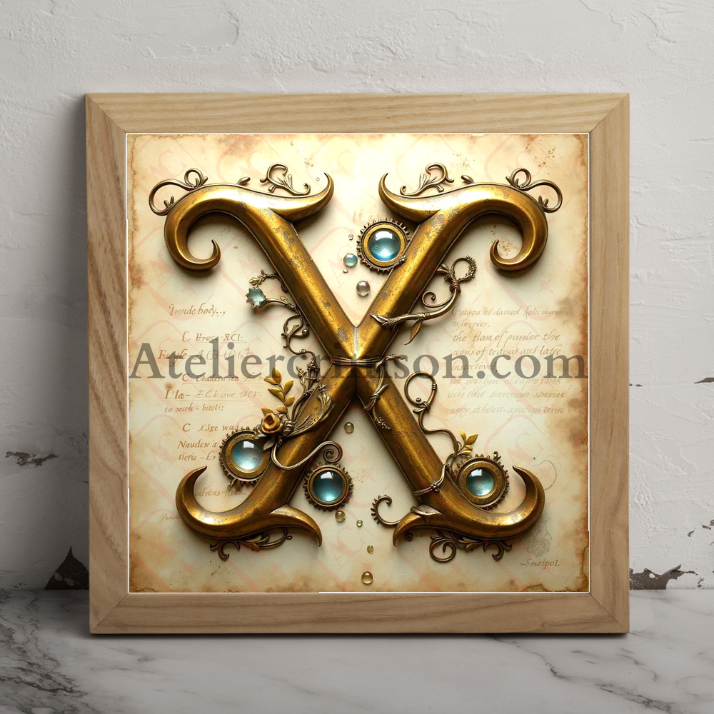 The letter X Art Nouveau alchemical Each character crafted as a stunning 3D brass sculpture with weathered patina, set against a mystical alchemical parchment. Ornate vines, floating bubbles, and antique gears create a magical shabby chic atmosphere. Perfect for vintage-inspired designs, book covers, or unique wall art."