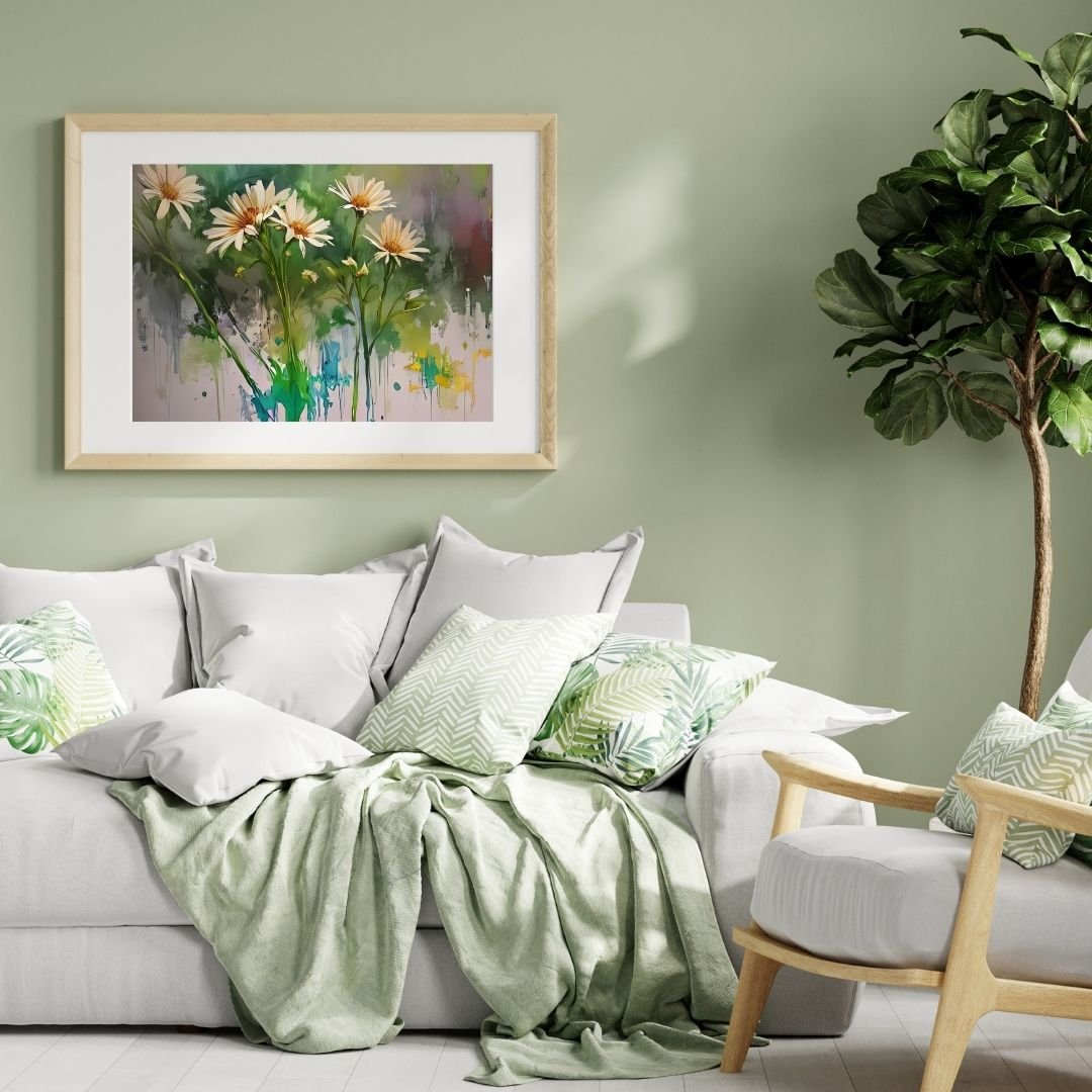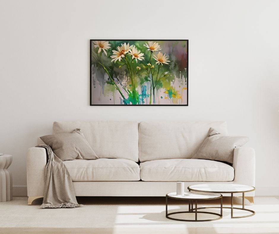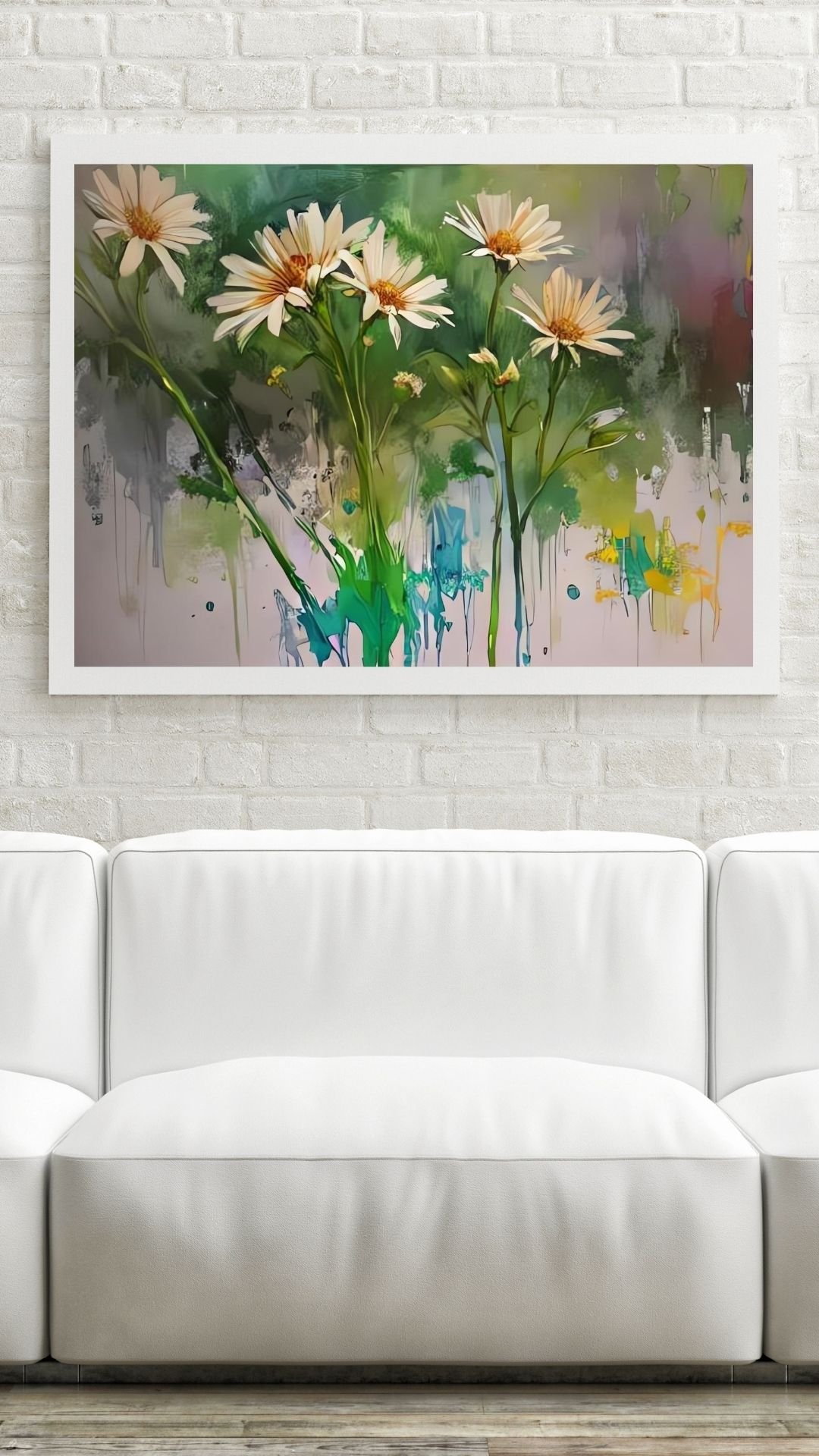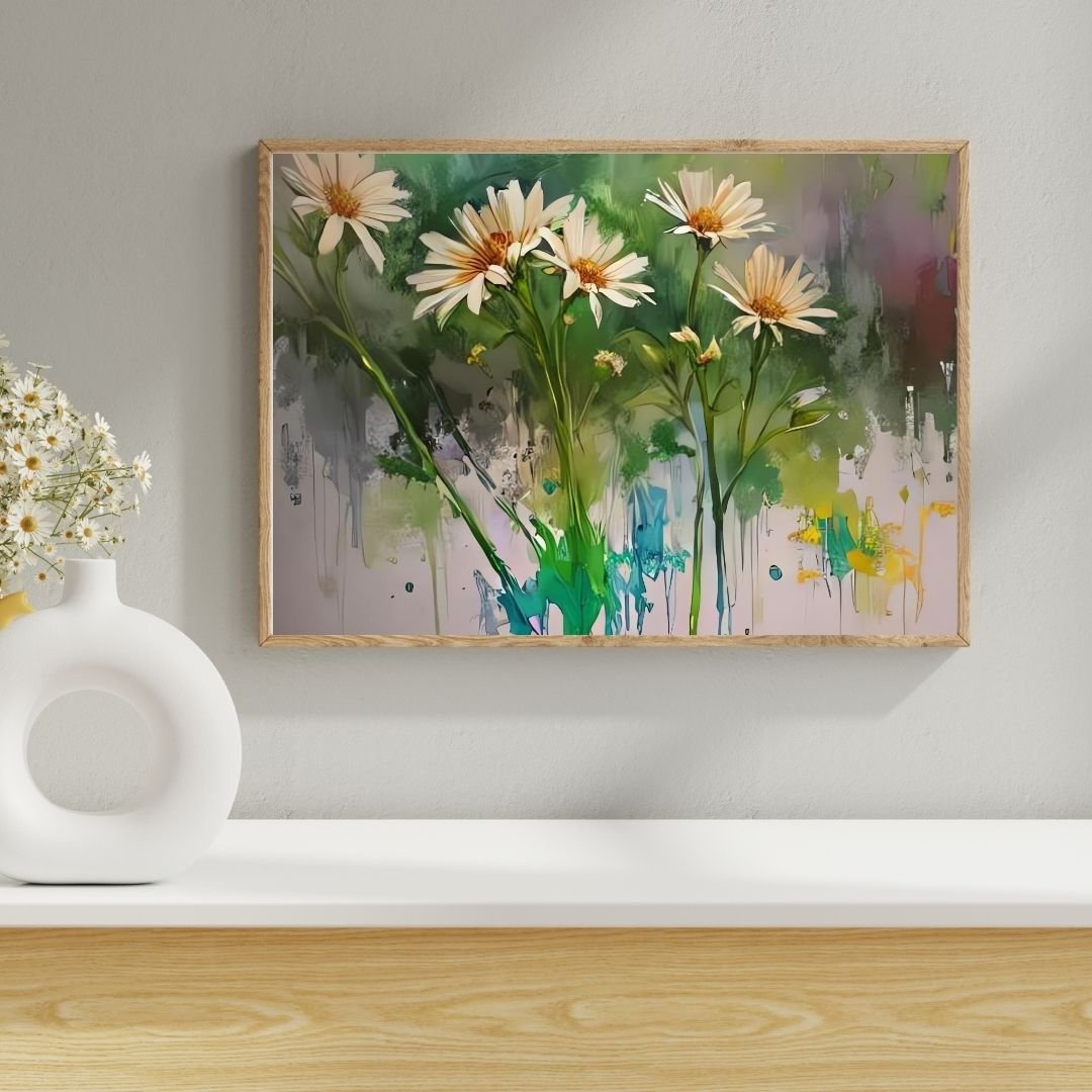 Bring the gentle beauty of nature into your home with this boho botanical daisy print. Digitally reimagined in a soft watercolor style, the delicate white petals and flowing brush-like strokes create a feeling of peace, lightness, and joy—making it the perfect piece to brighten up any room.