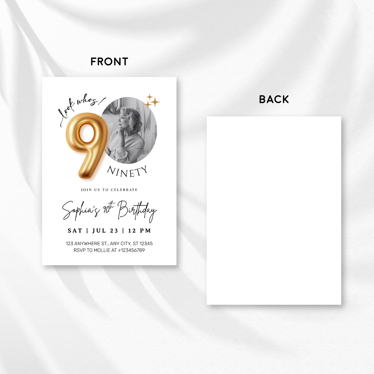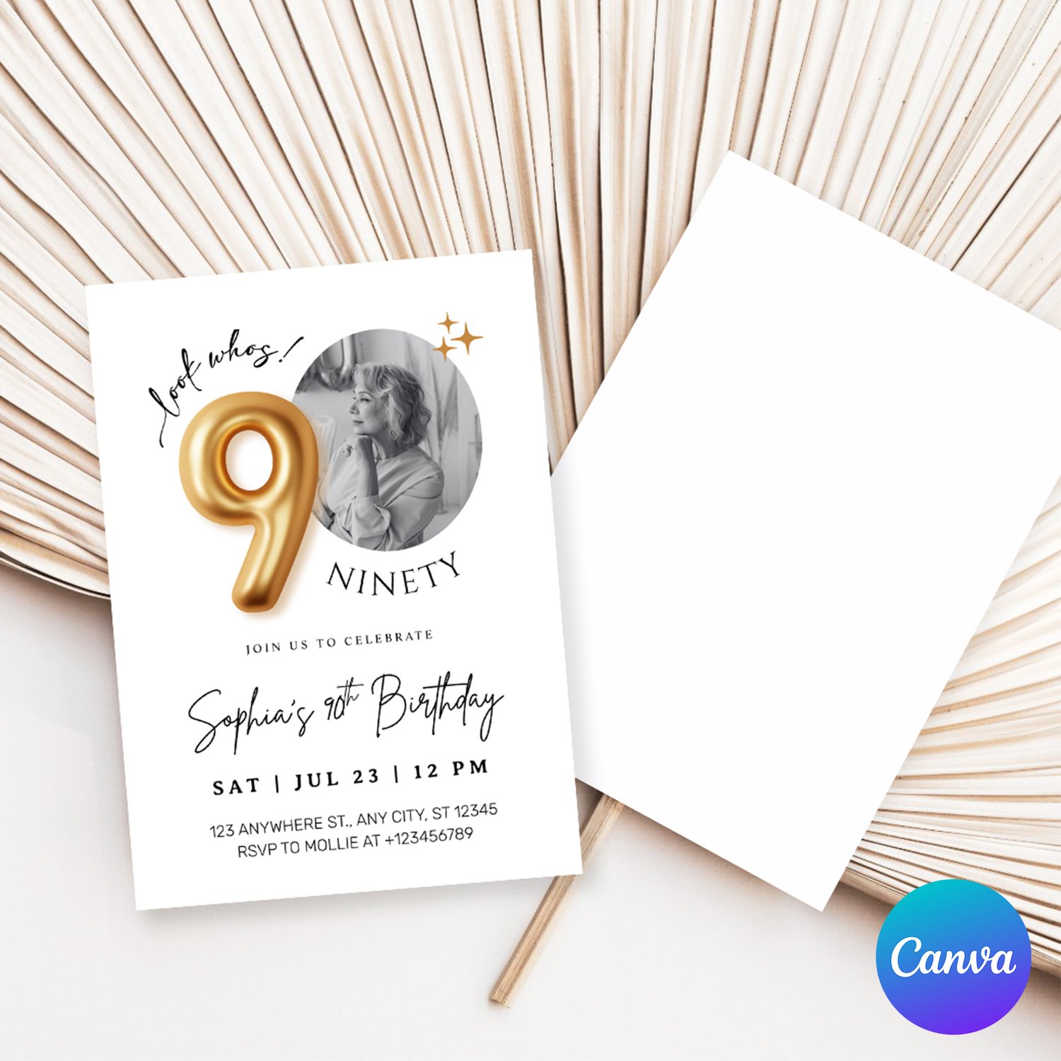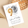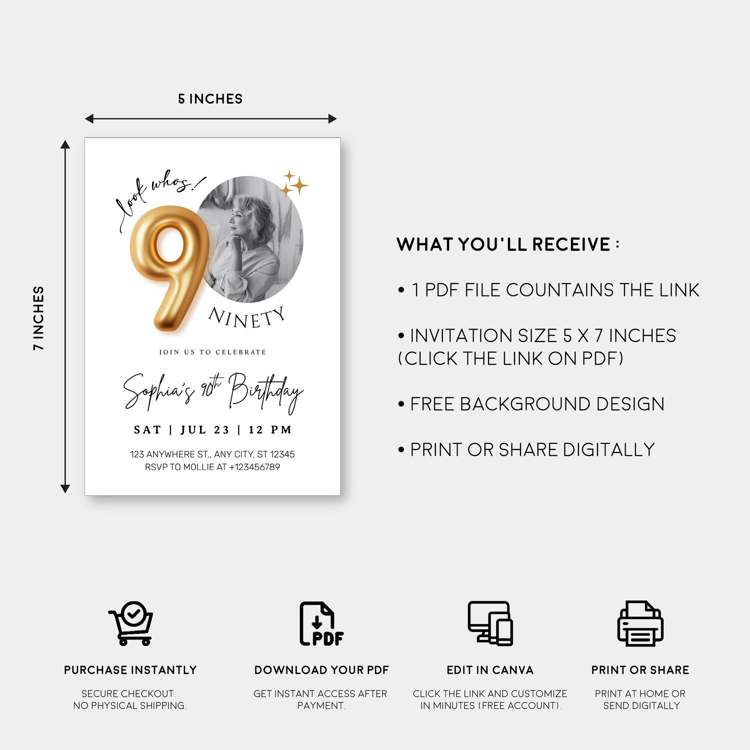 Modern Minimalist 90th Birthday Gold Balloon Photo Invitation Template | Elegant Milestone Party Invite | Editable & Instant Download