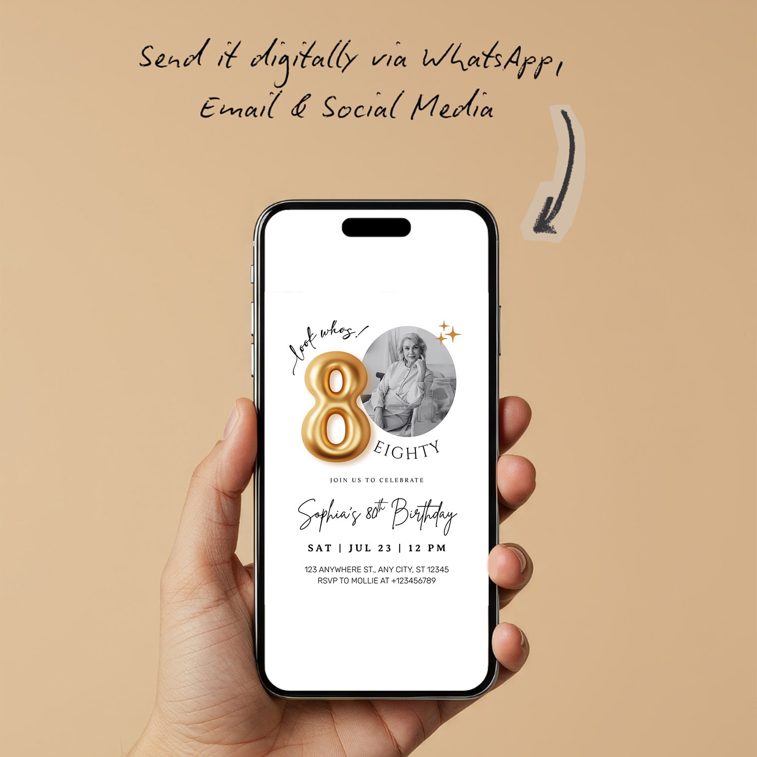 Featuring elegant gold balloon typography and a clean minimalist layout, this design allows you to add a personal photo β making your celebration even more memorable.