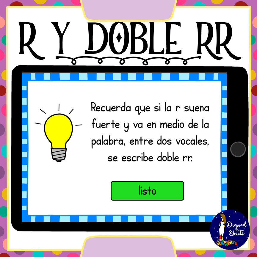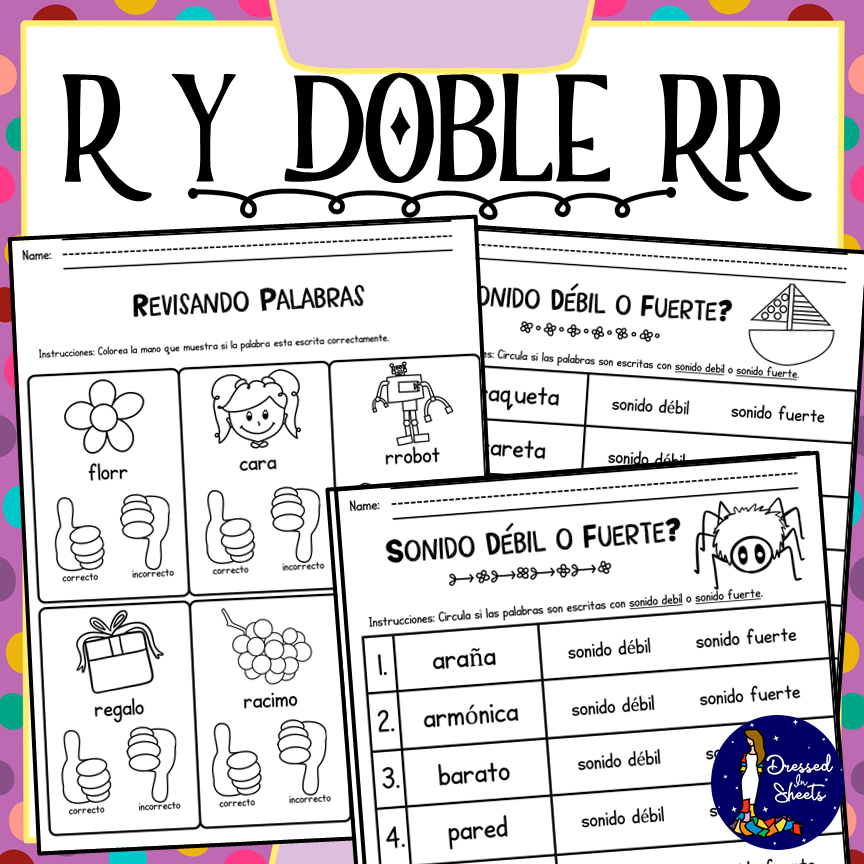 Las tarjetas digitales y paginas incluidas ayudarán a los pequeños a comprender mejor qué palabras necesitan una r o doble rr. También sabrán qué palabras usan el sonido fuerte o el sonido débil de la letra r completando las tarjetas y las paginas incluidas.
