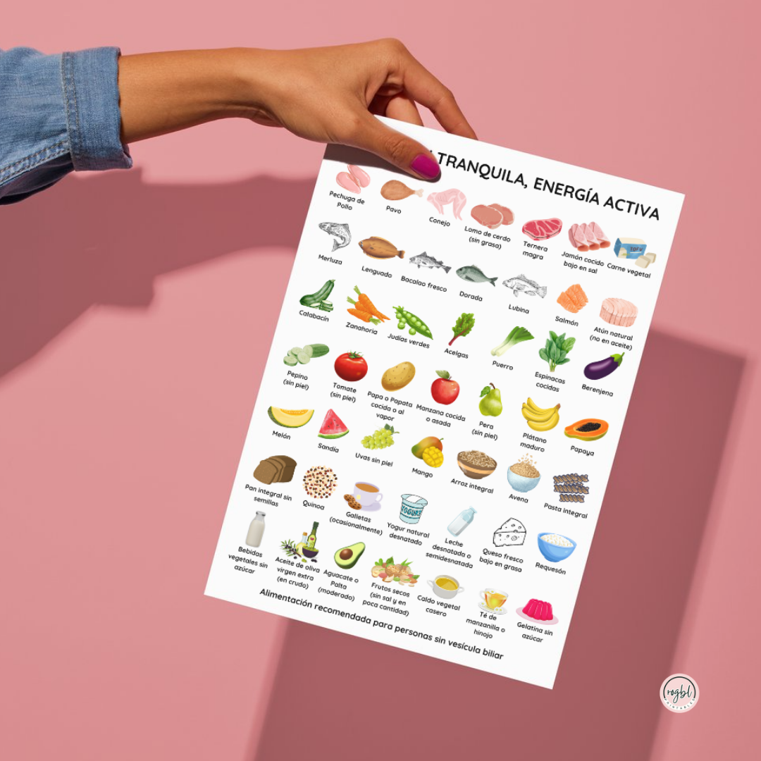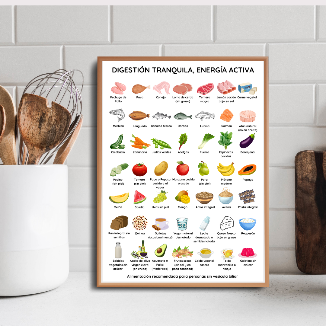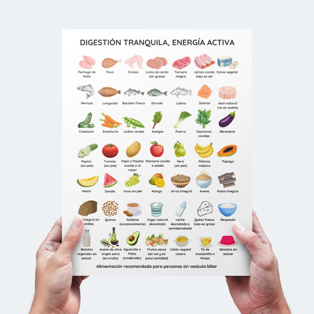 Recibirás una guía visual de alimentación recomendada para personas sin vesícula biliar, que incluye carnes magras, vegetales cocidos, frutas suaves, cereales integrales y otros alimentos fáciles de digerir.