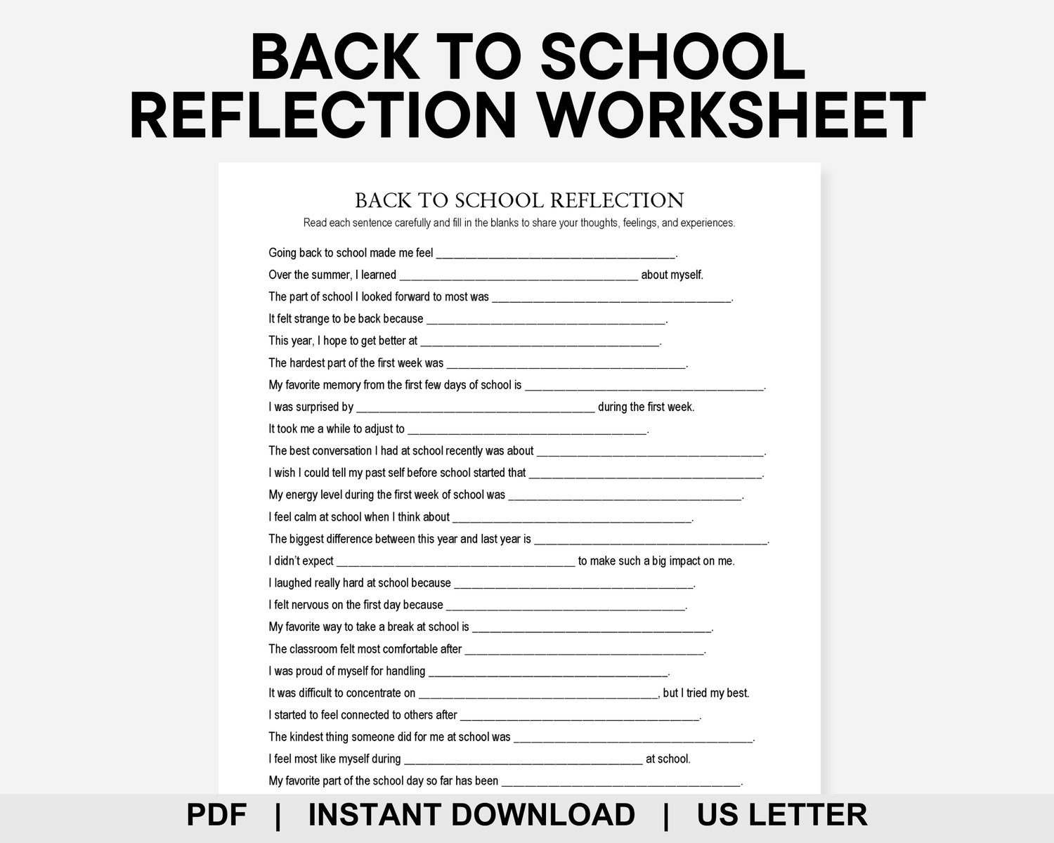 Back to School Reflection Worksheet, First Day of School, Classroom Activity, School Counseling, Conversation Starters, Self Reflection