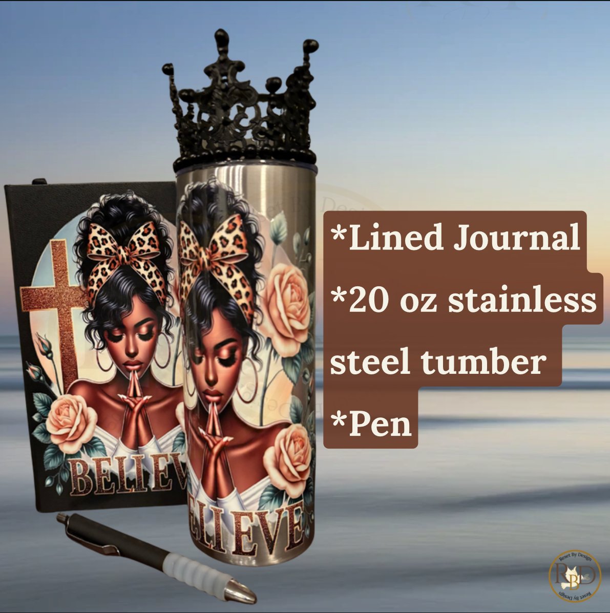 Stay inspired with this beautiful matching bundle! Includes a 20 oz stainless steel tumbler with crown and 5x7” hardcover journal—both featuring a stunning illustration of a praying woman with the word BELIEVE.