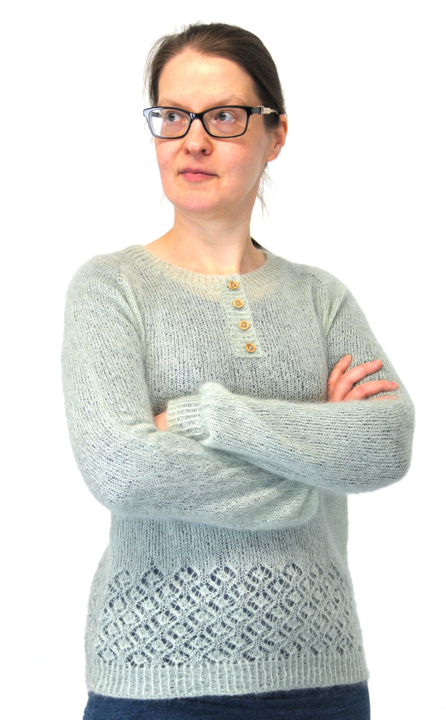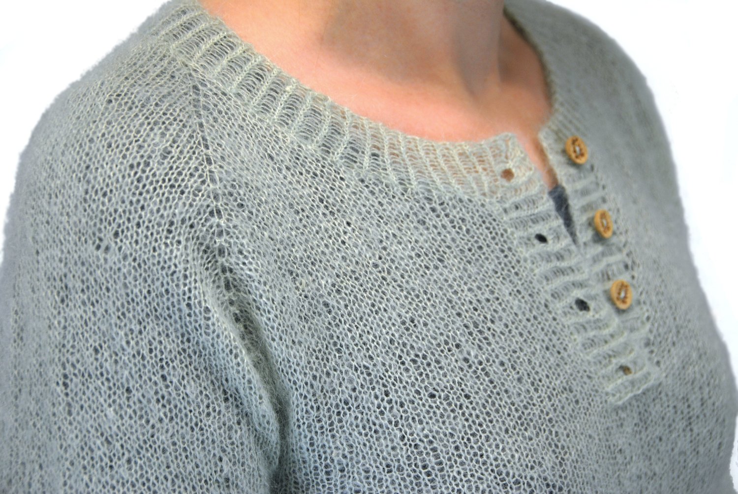 Designed with decorative median increases at the raglan lines, the sweater allows you to choose between long bishop sleeves that gather softly at the cuff or breezy short sleeves for a lighter option. A delicate lace motif reminiscent of shooting stars graces the hem. The timeless henley neckline and button plackets are done in twisted ribbing and include mitered increases for crisp corners.