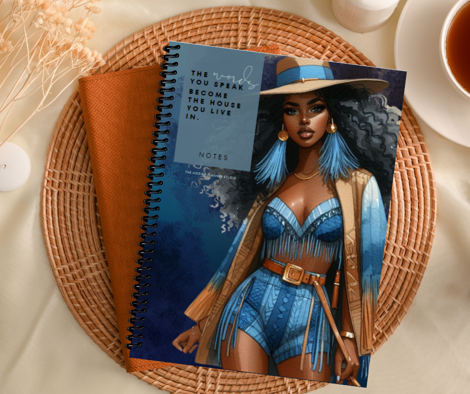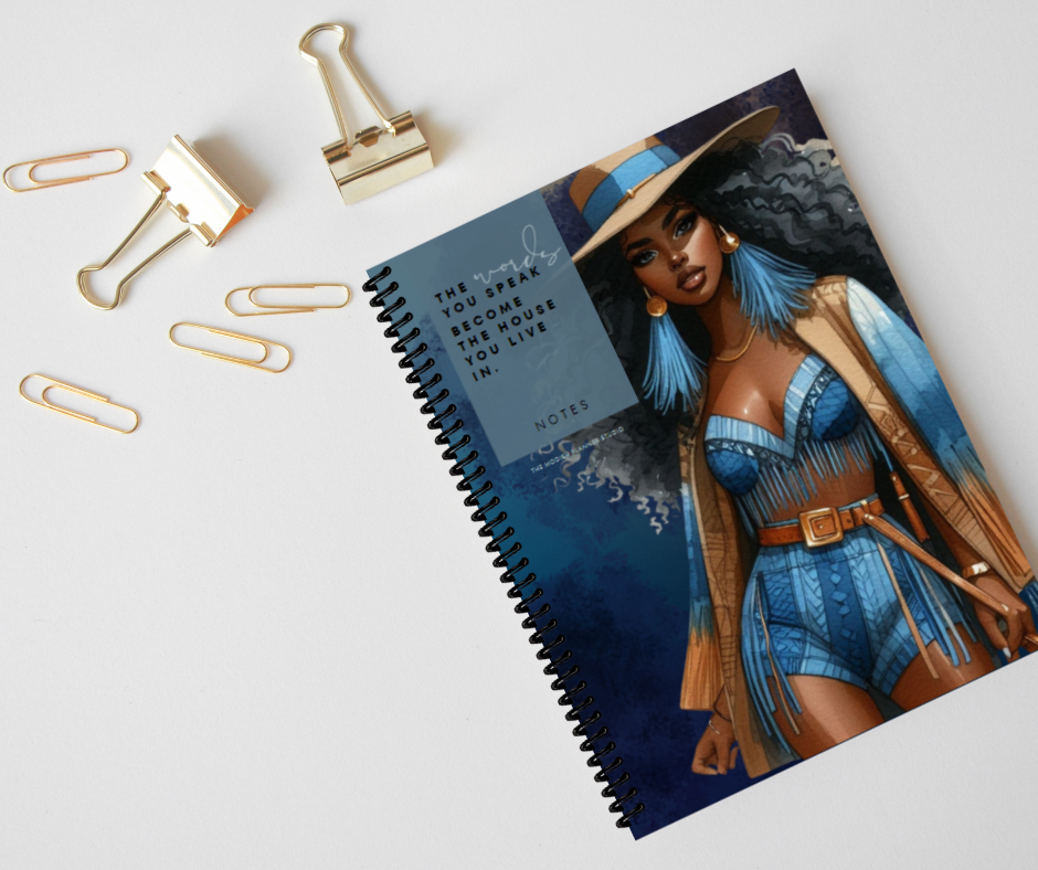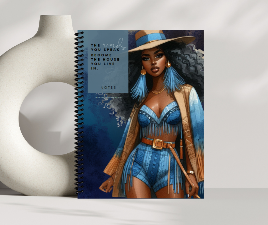 Organize in style with our "The Word's You Speak" Notebook. Featuring a gorgeous watercolor illustration of an African American fashionista, this notebook inspires with the quote, "The words you speak become the house you live in."