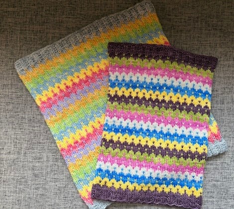 Shown in Fibernymph Dye Works Bounce mini skeins (80% superwash merino/20% nylon; 80 yds./73 m per 0.7 oz./20 g); samples used six (seven) mini skeins