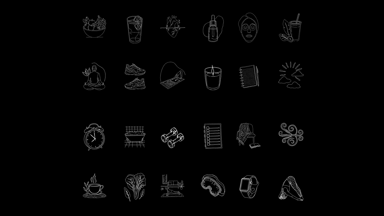 Bring wellness and calm to your creative projects with this exclusive collection of 24 hand-drawn line doodles focused on healthy lifestyle and self-care.
