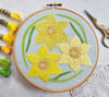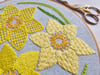 Inspired by daffodils and Medieval embroidery. The main stitches used in the pattern are often found in Medieval embroidery: Bayeux stitch, brick stitch, and trellis stitch. They give a lovely texture to the embroidery. When worked in six stranded embroidery thread/floss, they also have a beautiful light effect. The pattern can also be worked in wool thread if you prefer.
